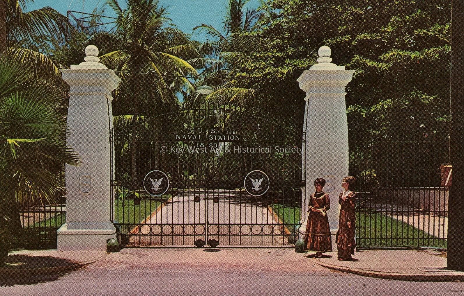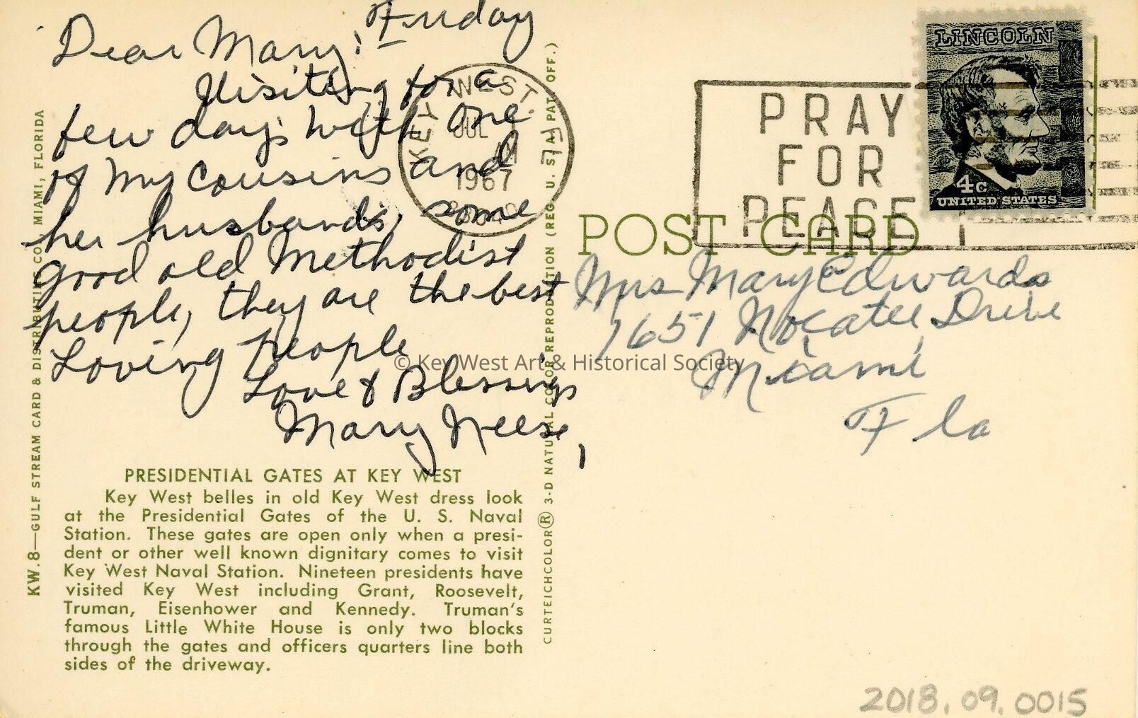 Postcard depicting the Presidential Gates in Key West. Description on verso reads, 'Presidential Gates at Key West. Key West belles in old Key West dress look at the Presidential Gates of the U.S. Naval Station. These gates are open only when a president or other well known dignitary comes to visit Key West Naval Station. Nineteen presidents have visited Key West including Grant, Roosevelt, Truman, Eisenhower and Kennedy. Truman's famous Little White House is only two blocks through the gates and officers quarters line both sides of the driveway.' Message on verso reads, 'Dear Mary, visiting for a few days with one of my cousins and her husband. Some good old Methodist people, they are the best loving people. Love & blessings, Mary Neese.'Collection