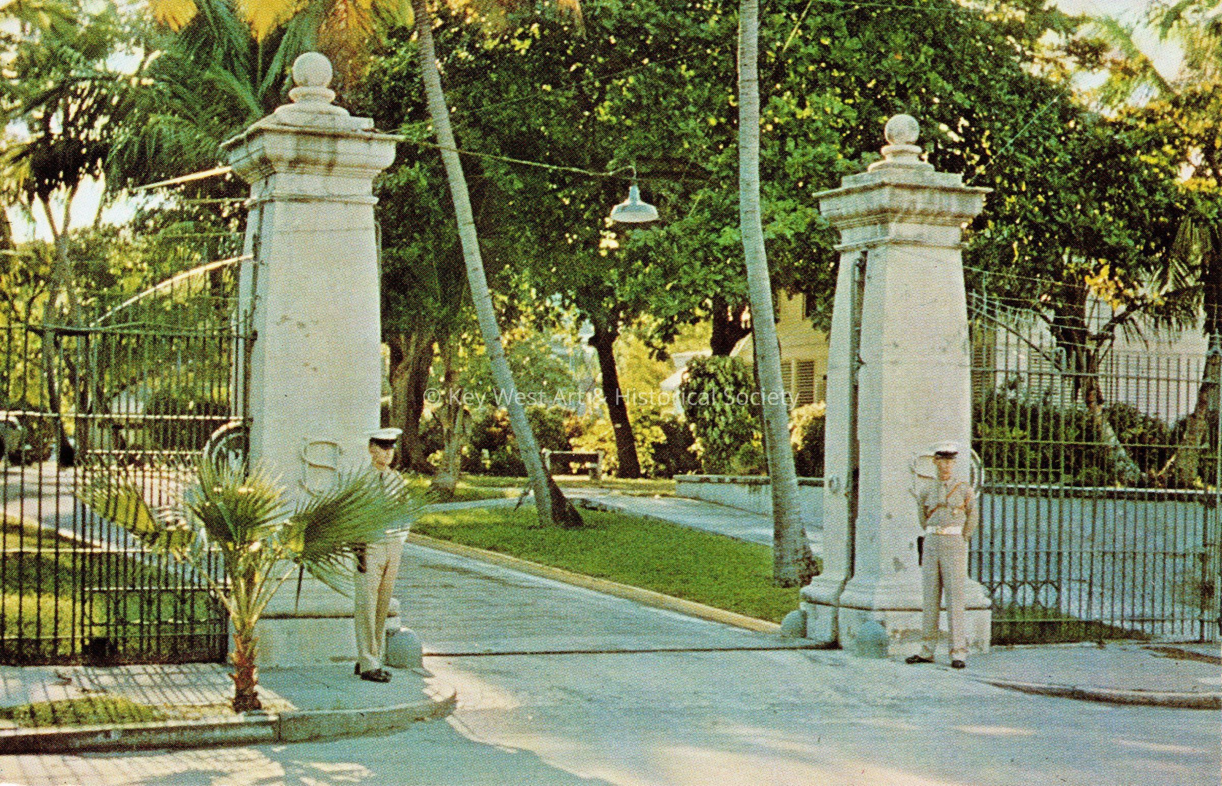 Postcard depicting two military men standing in front of gates. The description on the verso reads, 'Presidential Gates. These gates, located on Caroline Street at Key West Naval Station, are opened only when a President visits the Station. Nineteen presidents have visited Key West, the Naval Gibraltar of the Caribbean and one of the greatest anti-sub warfare training centers in the World.'Subject Place