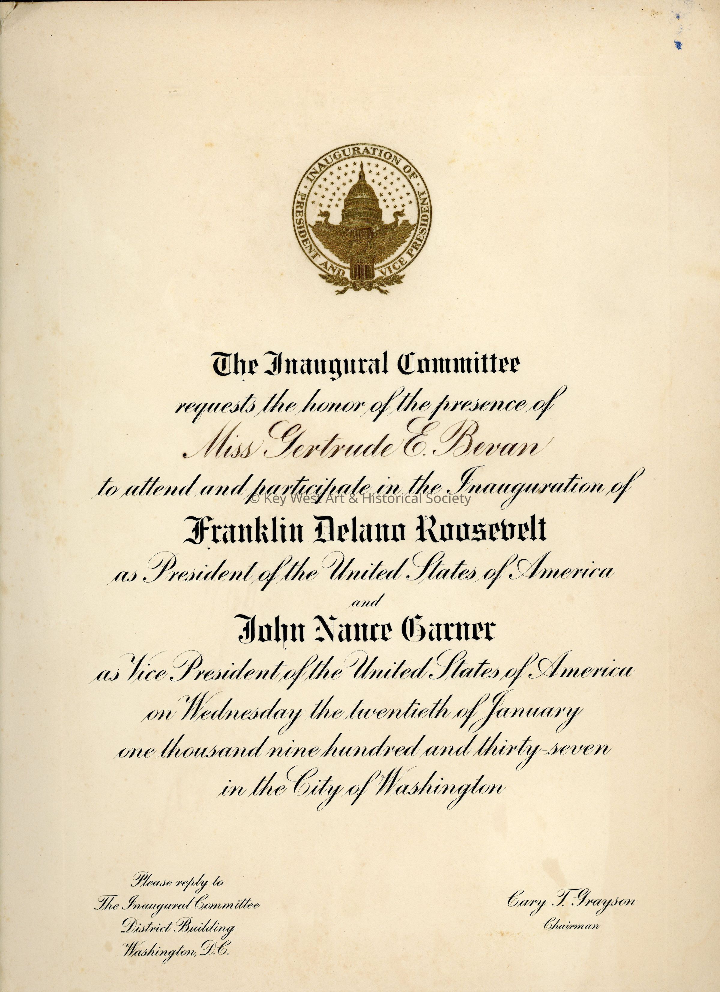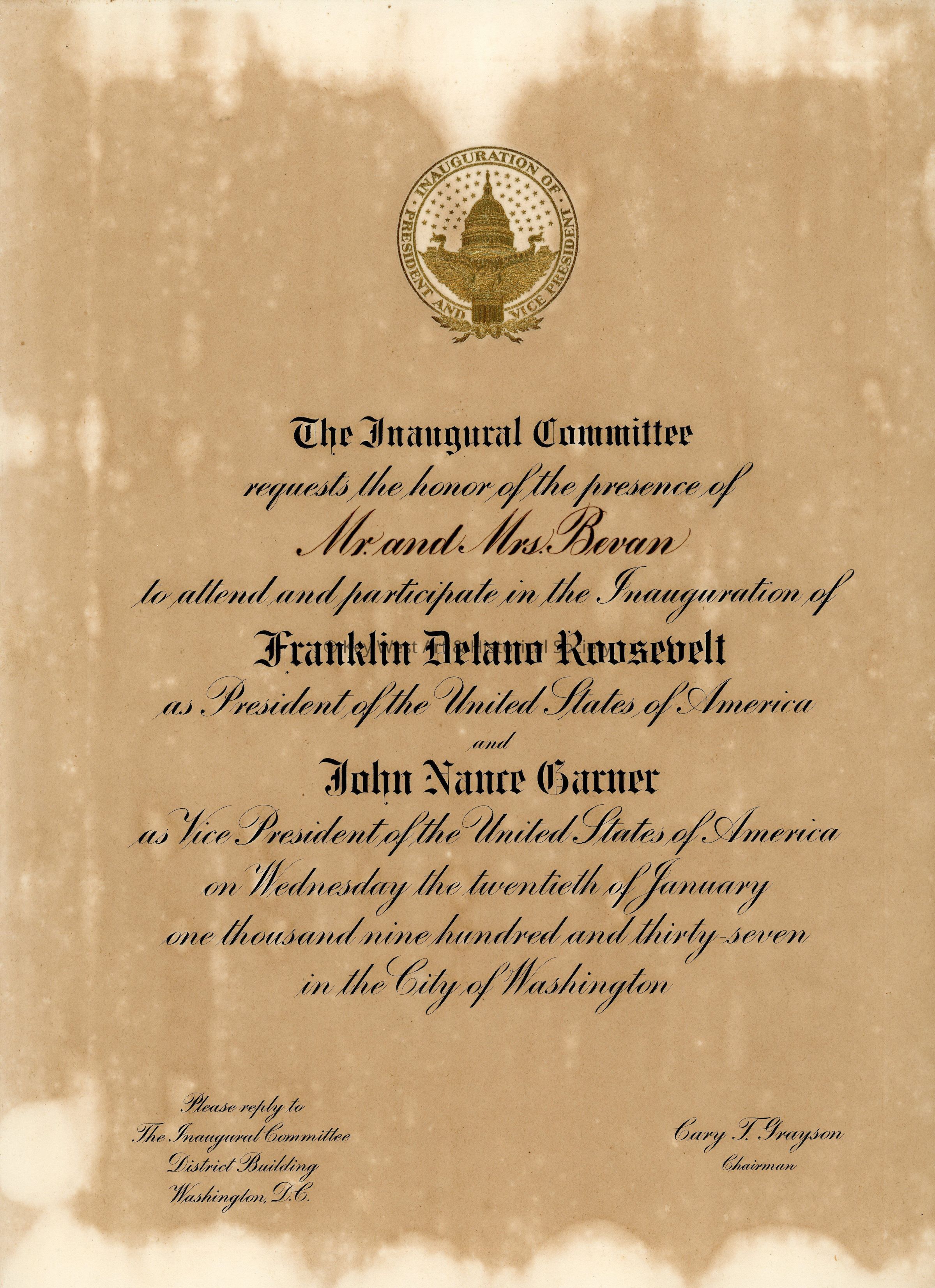 An invitation from the Inaugural Committee to Miss Gertrude E. Bevan to attend the inauguration of Franklin Delano Roosevelt as President and John Nance Garner as Vice President on January 20, 1937. The invitation consists of a folder with a loose invitation inside.Collection