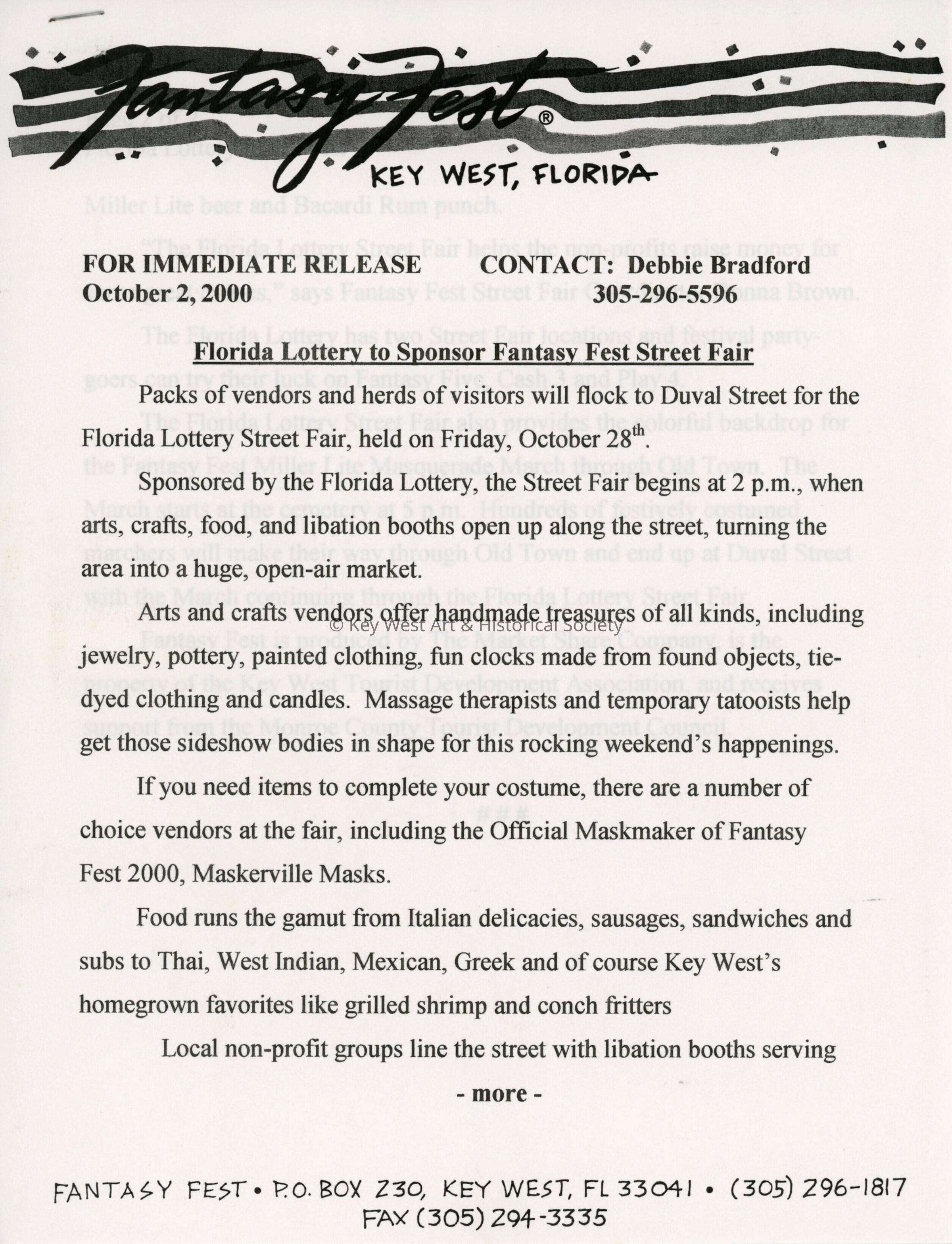 Press release about the Florida lottery being a Fantasy Fest sponsor.