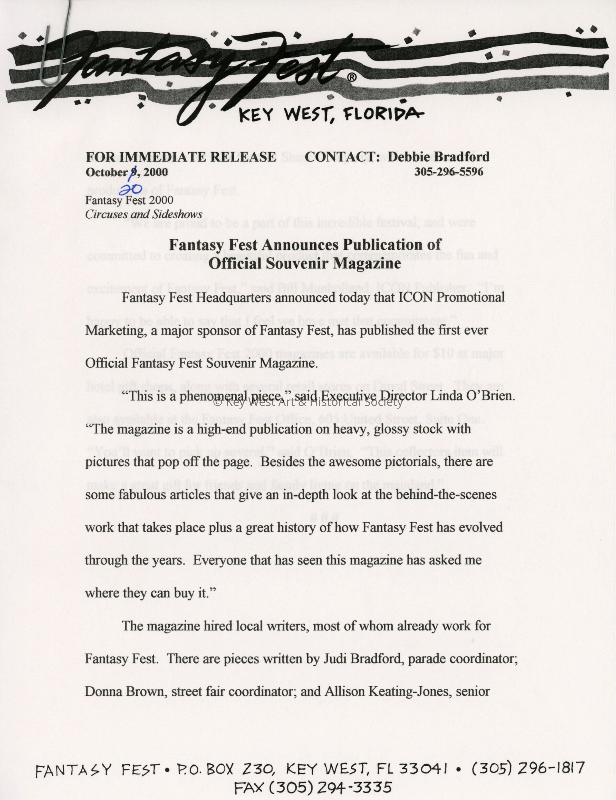 Press release announcing publication of the Fantasy fest souvenir magazine.
