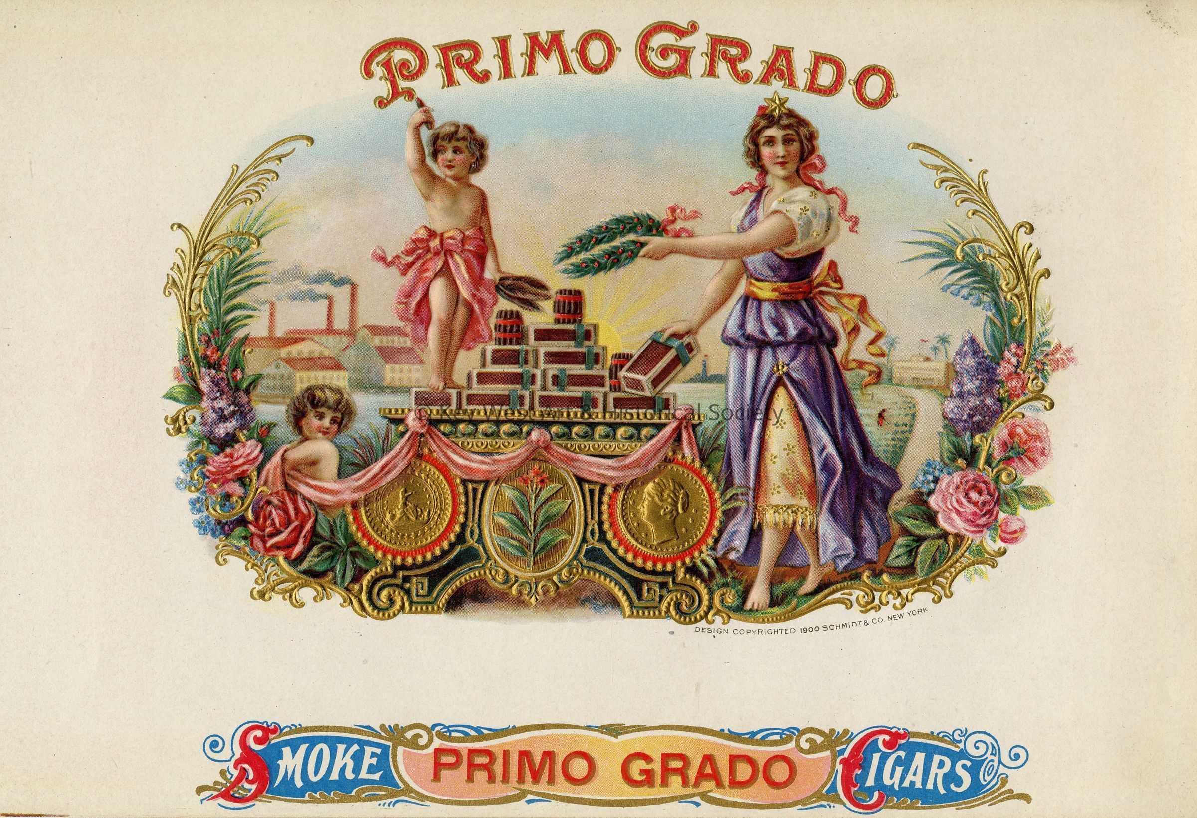 Full color lithograph inner cigar box label promoting Primo Grado Cigars. Likely taken from a sample book produced by the lithographer.Type of Print
