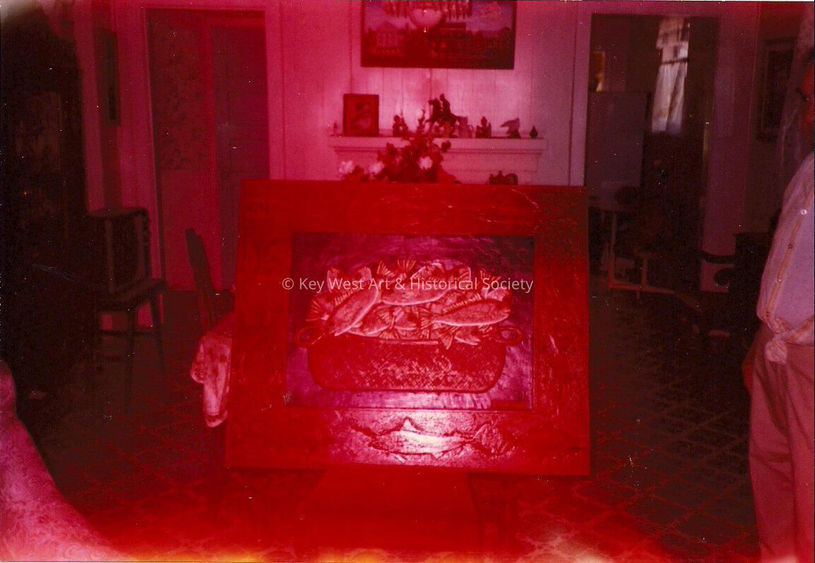 Photo of a carving of a tub full of fish in the living room of Mario Sanchez.