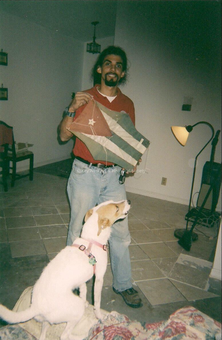 Photo of a man holding a tissue paper kite made by Mario Sanchez.