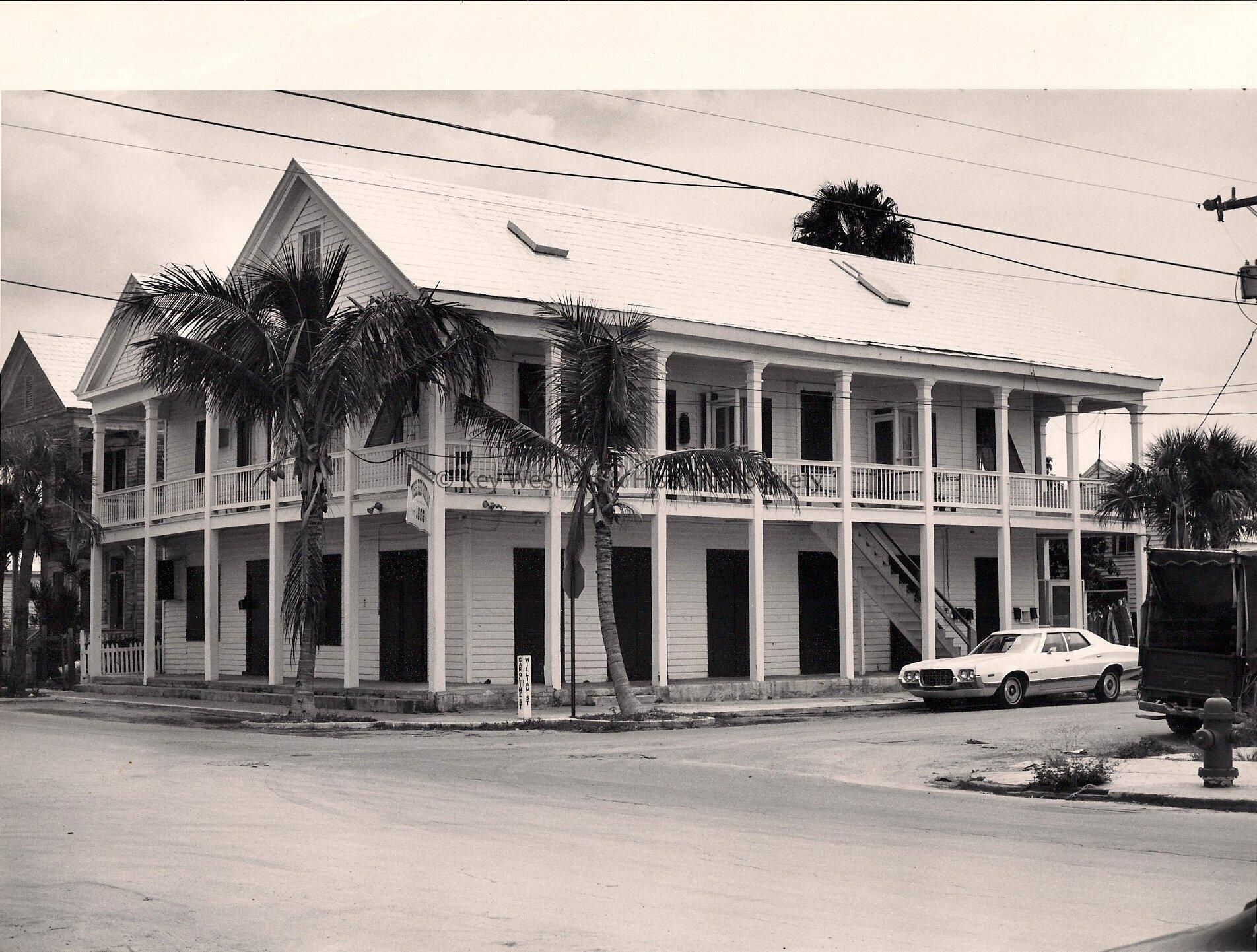 Black and white photo of The Red Doors located on the corner of William and Caroline St (800 Caroline). Pinder and Curry families. Accession # 2005.21.0001
