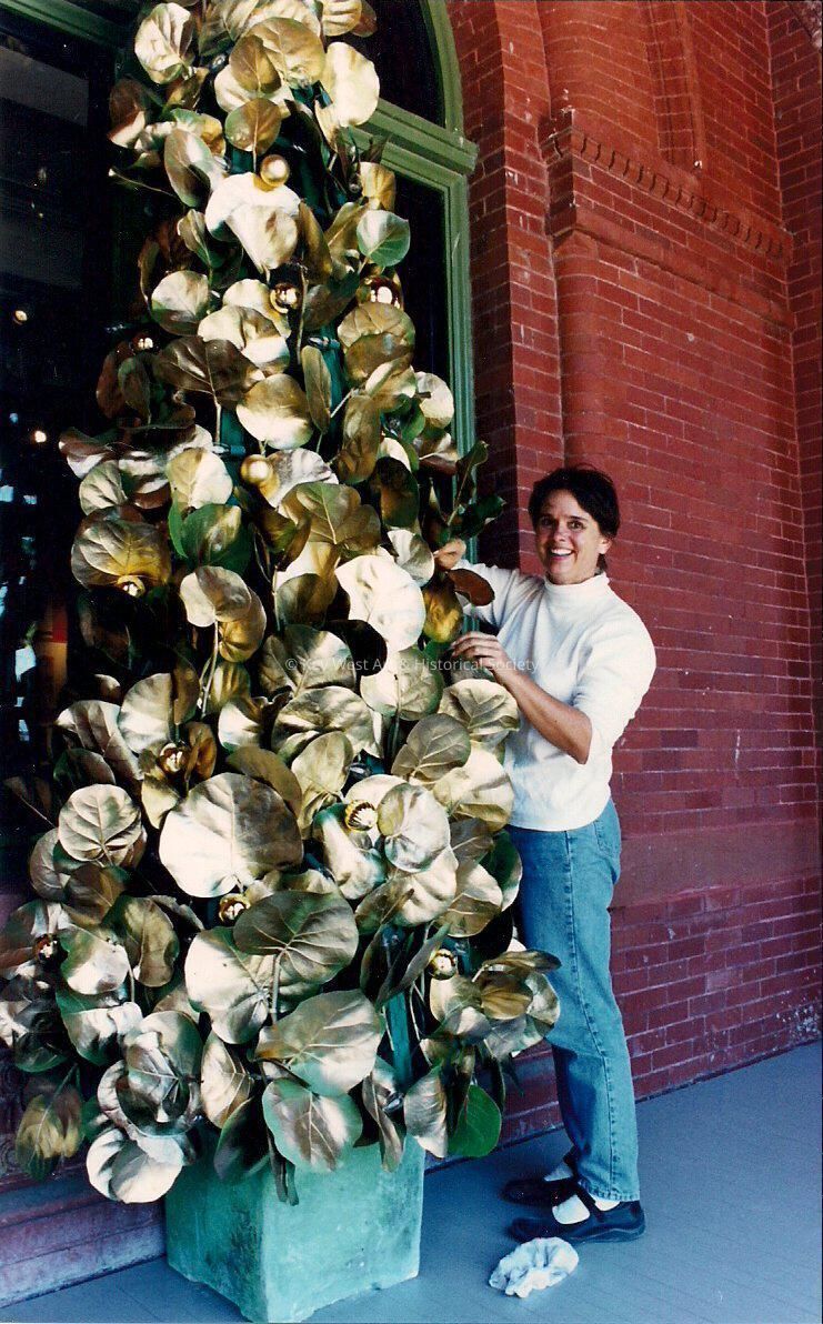 Photo showing a woman decorating a tree ourside the Customs House located on Front St.