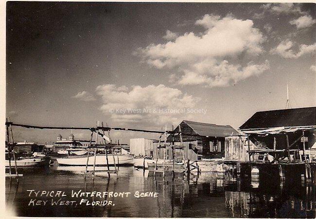 Black and white photo of "Typical Waterfront Scene Key West, Florida". Image is of a warf in Key West the "Curry and Son's" building can be seen in the distance.