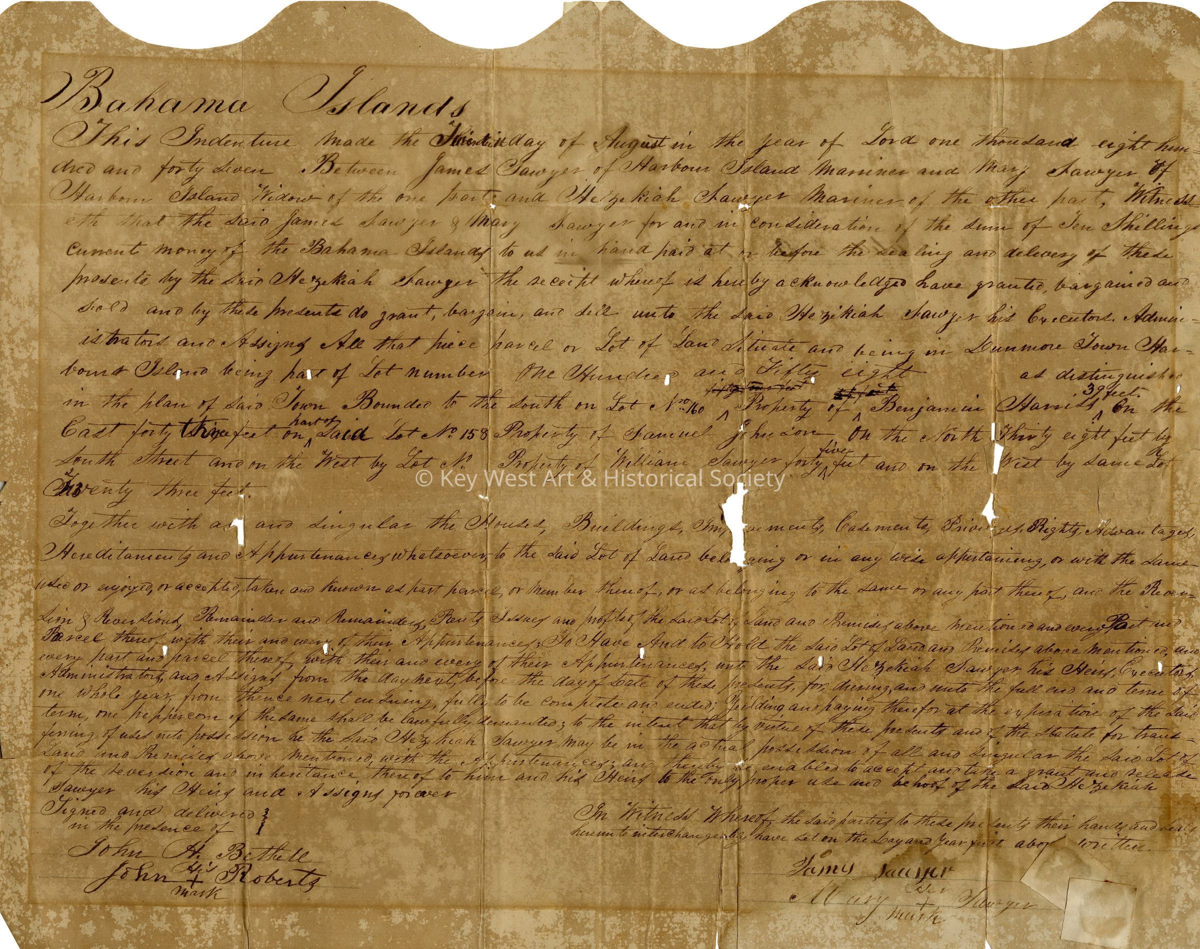 Property transfer deed for land and buildings in Harbour Island, Bahamas. The owners, James and Mary Sawyer, sold the land to Hezebiah Sawyer. Witnessed by John H. Bethel and John Roberts.Collection