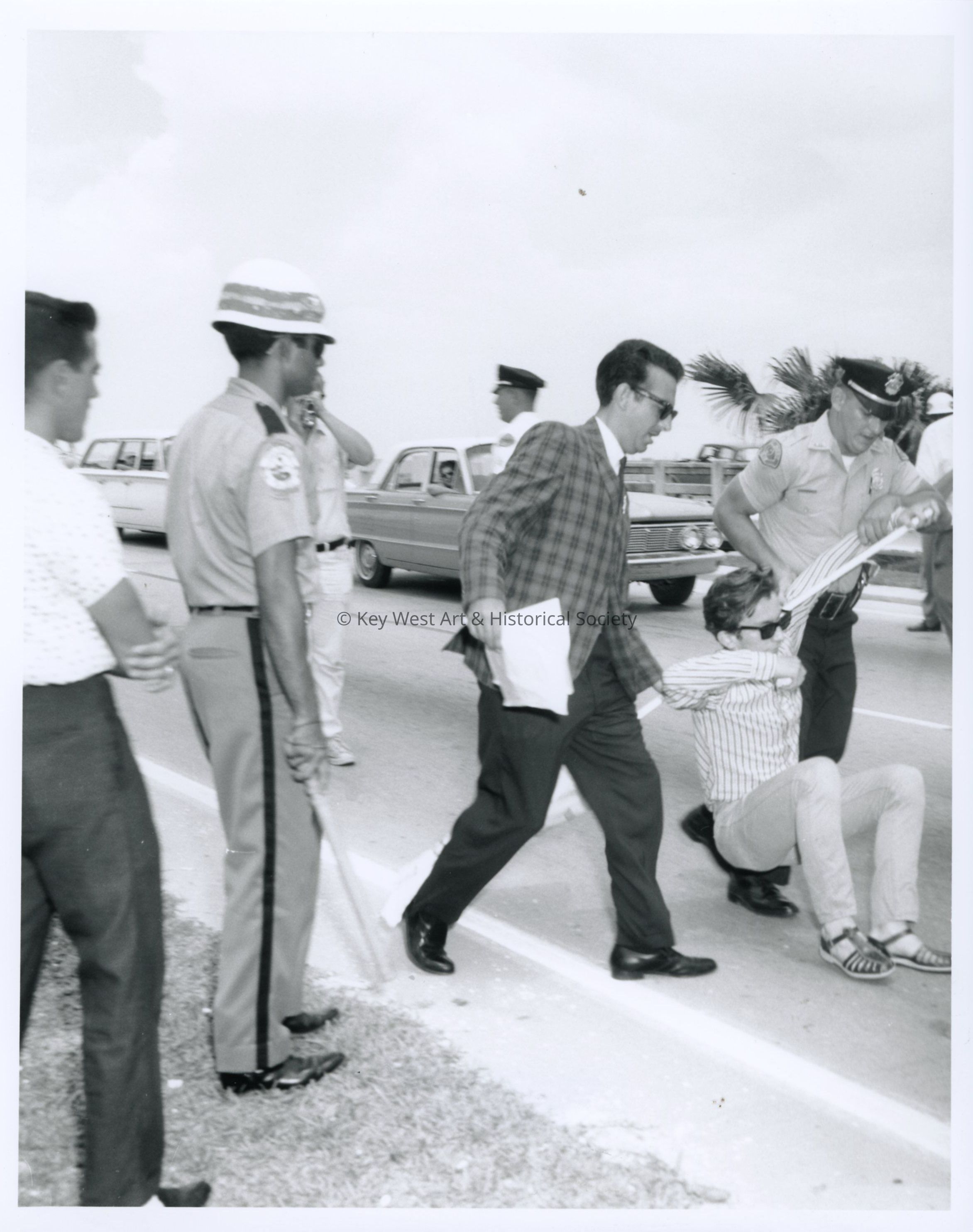 Black and white photograph of a protester being carried away on the overseas highway in the mid 1960s.