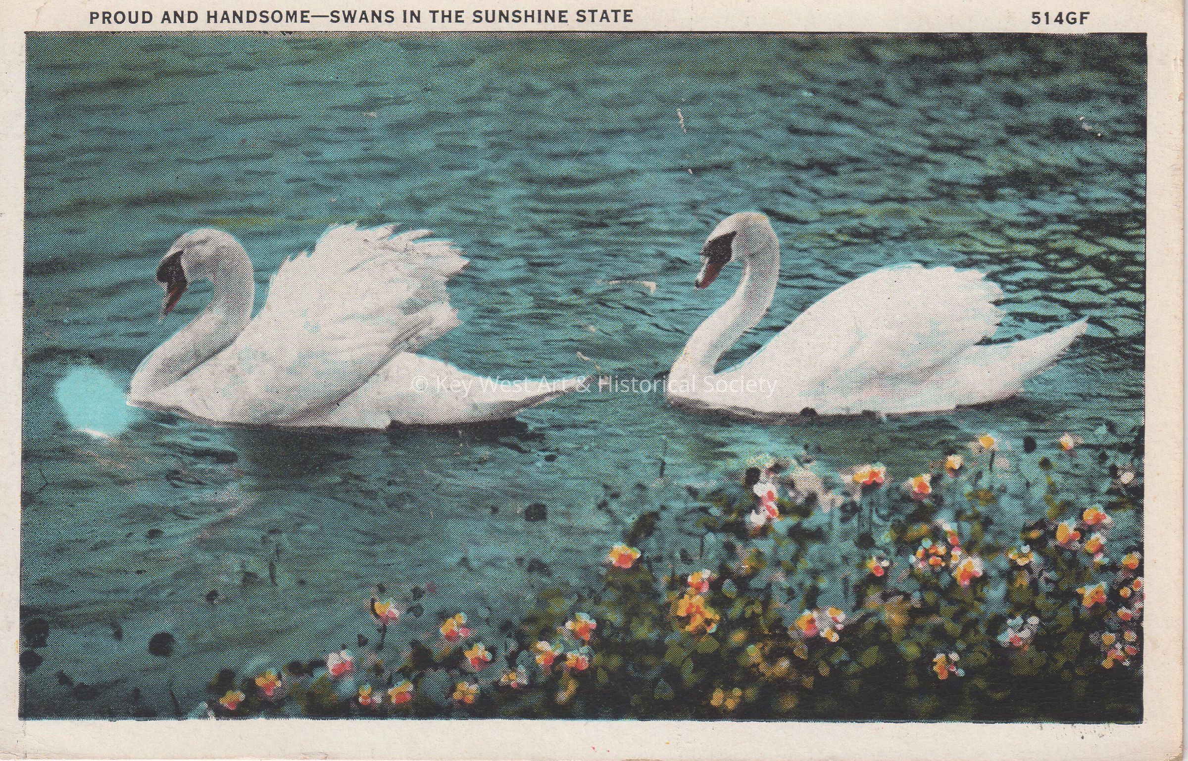Postcard depicting two swans. The caption reads, ‘Proud and Handsome—Swans in the Sunshine State.’ The message on the verso reads, ‘Dear Mrs. Weyand, Well where are you now. Hope you received the mail I forwarded to you. Having an exhibit at the school – have three pictures in it. Getting some good things. Minnie H.’ The card is addressed to Mrs. W. T. Weyand, 334 Charlotte Street, St. Augustine, Florida, and is postmarked Sarasota, Florida, March 17, 1934.Subject Place