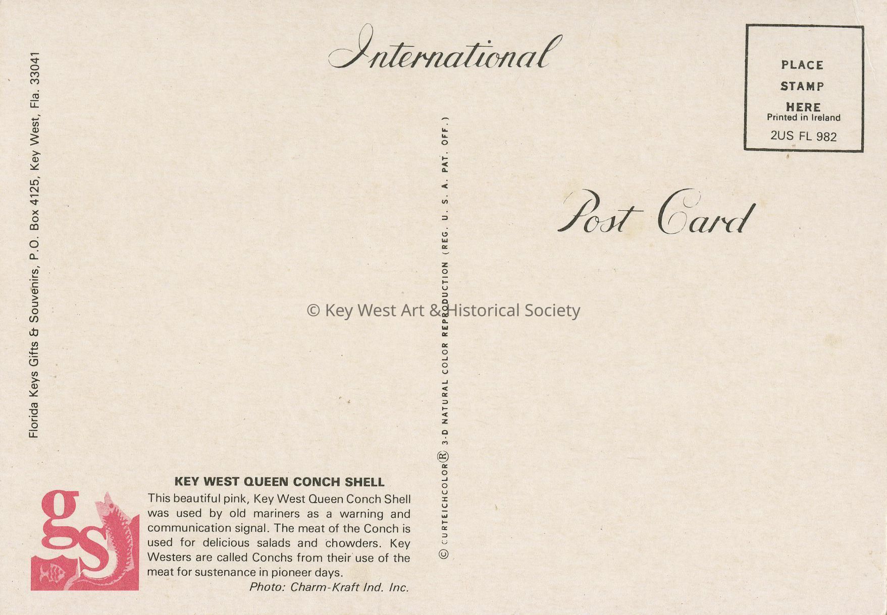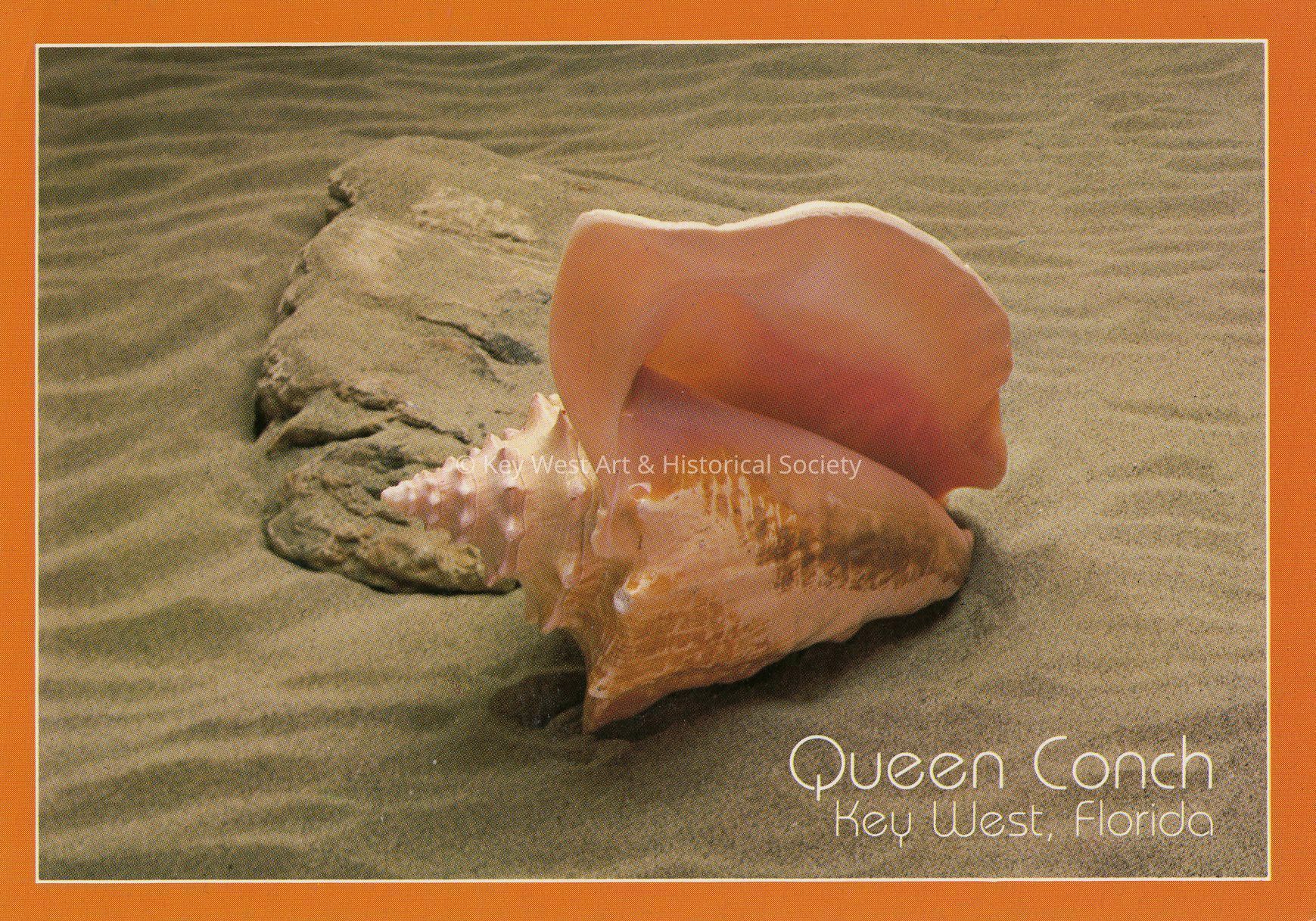 Postcard depicting a Queen Conch resting on a sandy ocean floor. Notation on verso, 'Key West Queen Conch Shell. This beautiful pink, Key West Queen Conch Shell was used by old mariners as a warning and communication signal. The meat of the Conch is used for delicious salads and chowders. Key Westers are called Conchs from their use of the meat for sustenance in pioneer days.'Collection