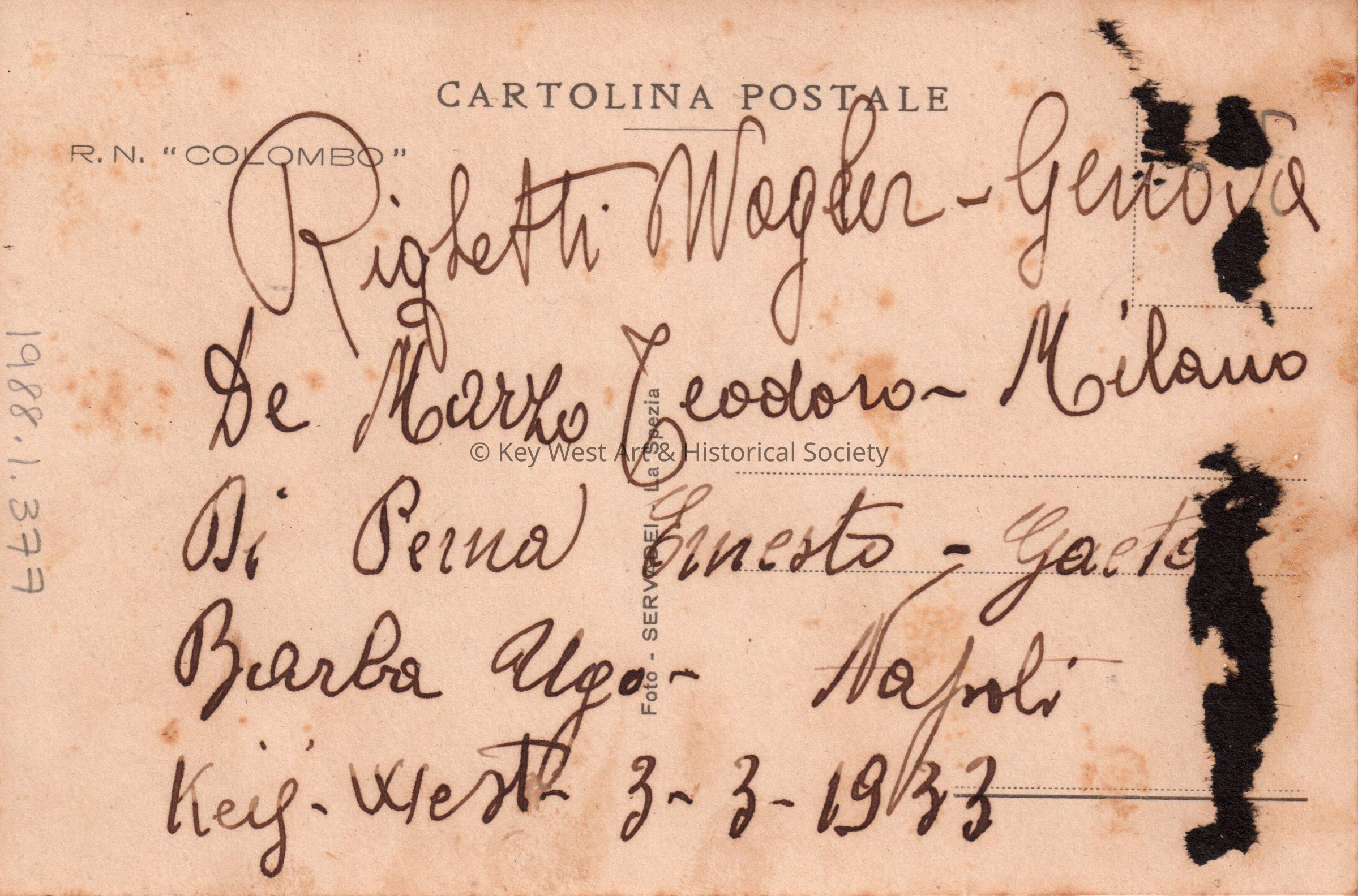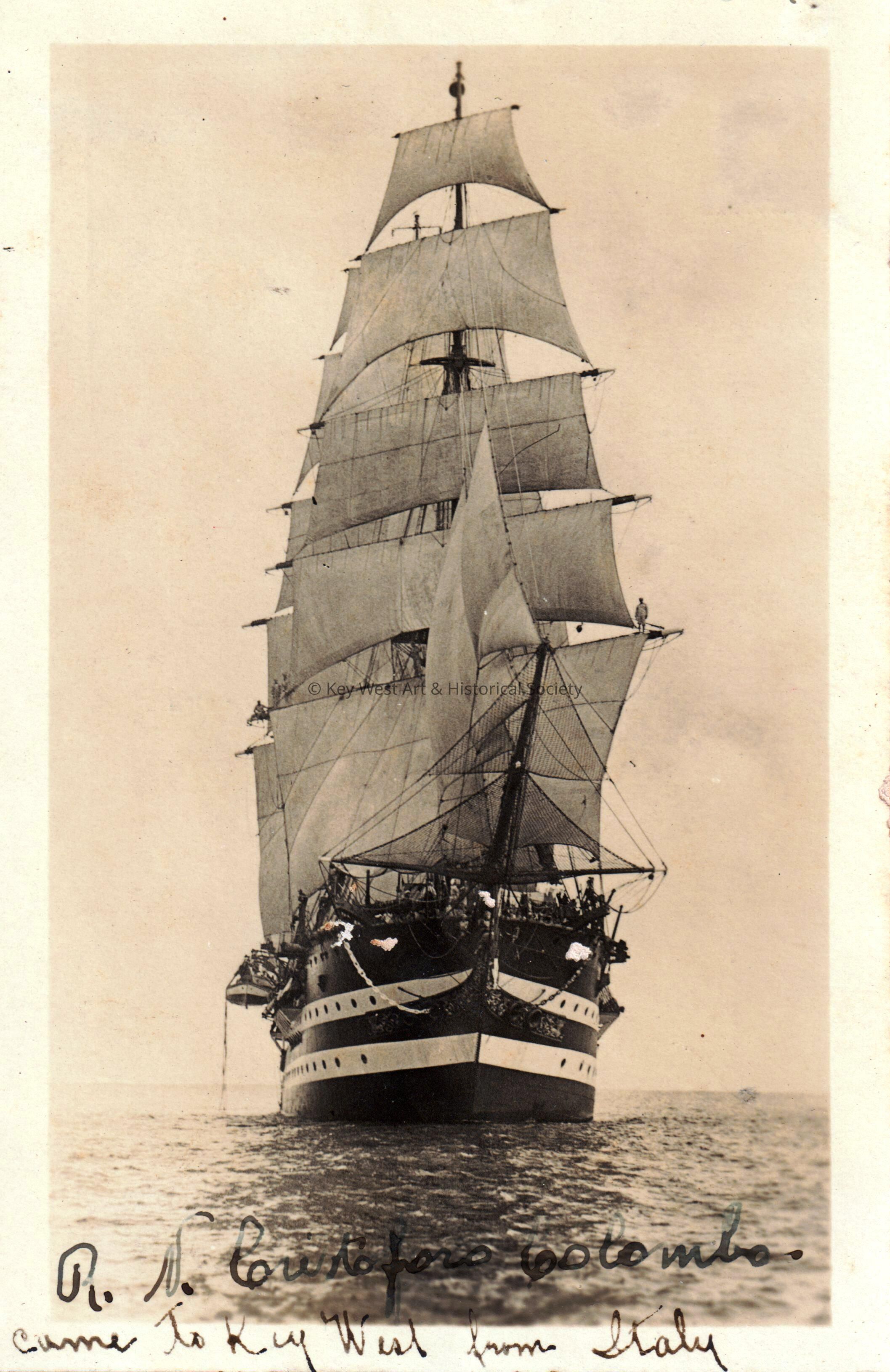 Postcard depicting a large sailing ship with sails unfurled. The caption reads, ‘R.N. Cristoforo Colombo came to Key West from Italy’. The description on the verso reads, ‘R.N. “Colombo”’. The message on the verso reads, ‘Rigleth Wogler - Genova; De Marko Geolooro - Milano; Di Perna Ernesto - Gaels; Borba Ugo - Napoli; Key West, March 3, 1933.'Collection