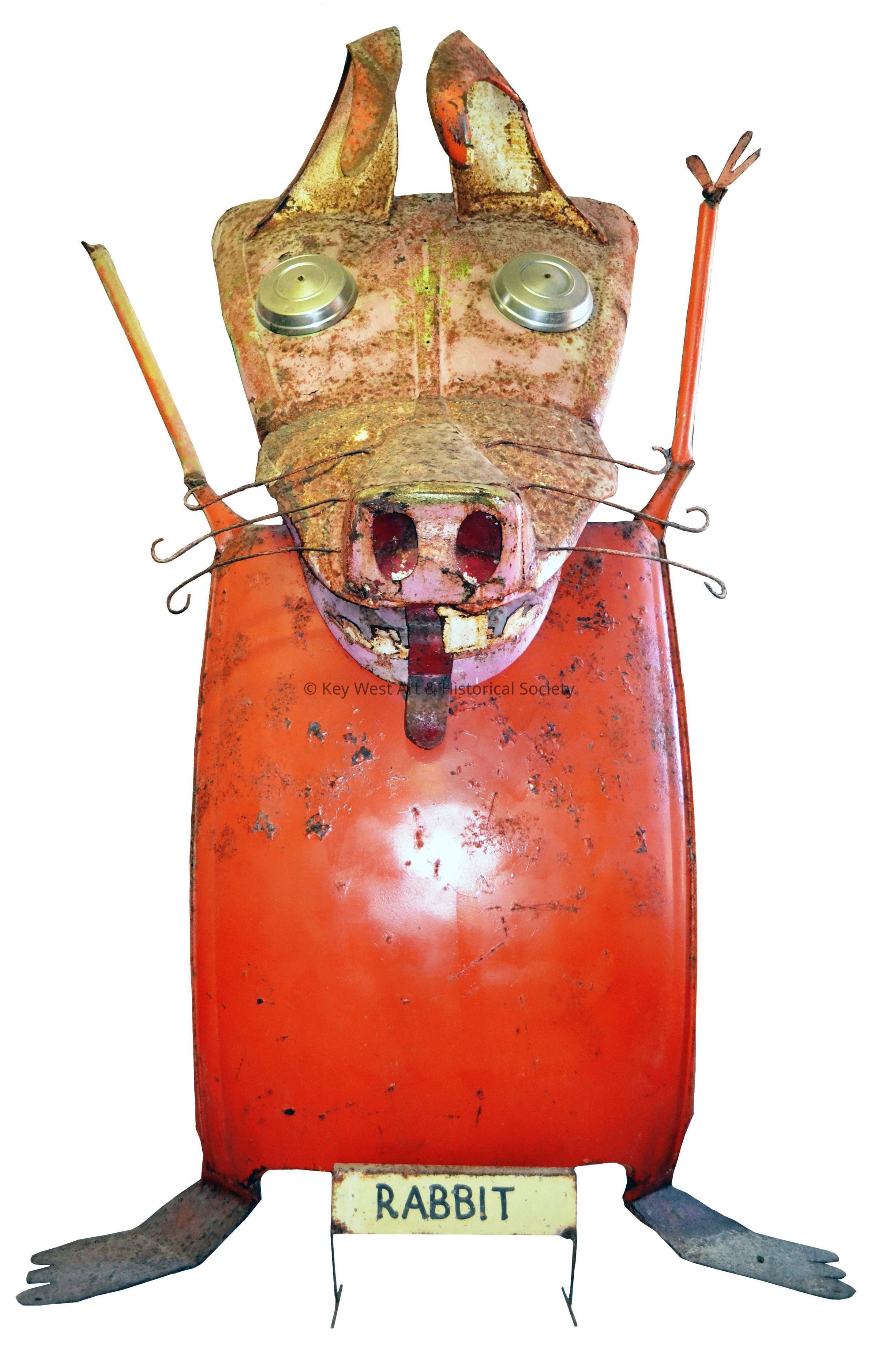 The verso has a cow-like face, weeping bloody tears. The large rabbit's ears are seen as horns for the cow. Also on the verso, painted lettering reads, 'Local Hassles. Did something about junk. They did nothing about Hassles. Enter at your own risk'. Inscription in the tail reads 'Do As I Say'.Type of Sculpture