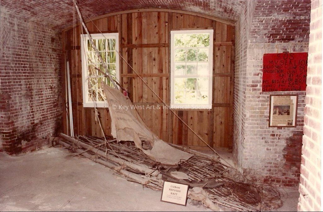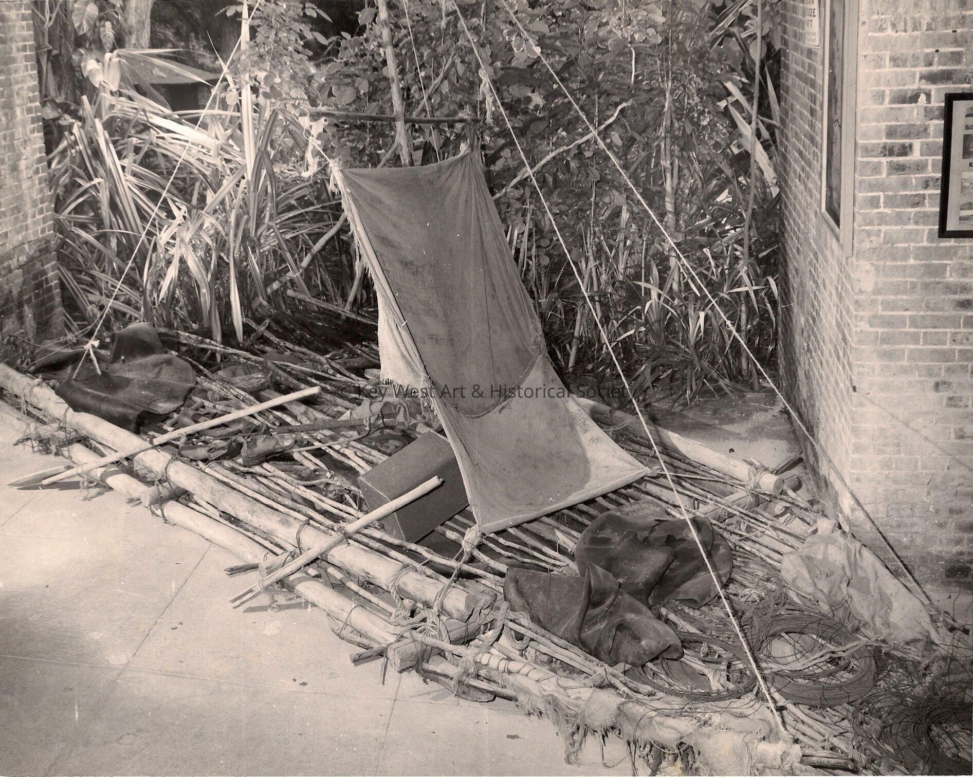 Cuban raft made of wood that has been held together by wire and cords. The sails are made of tobacco and manure bags.