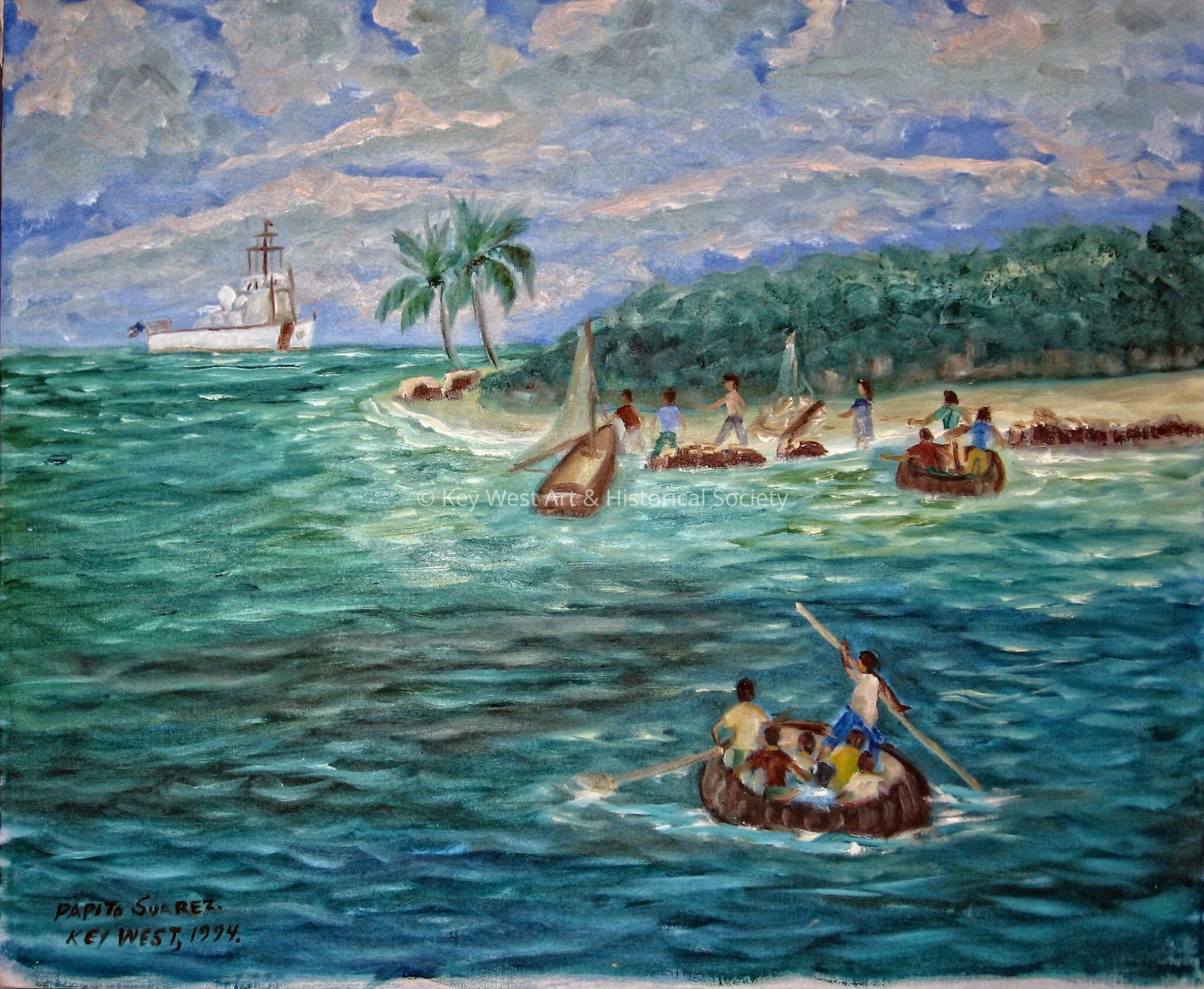 Oil on canvas by Papito Suarez depicting Cuban migrants in a makeshift boat pulling up next to an island while a U.S. Coast Guard vessel is visible in the distance.