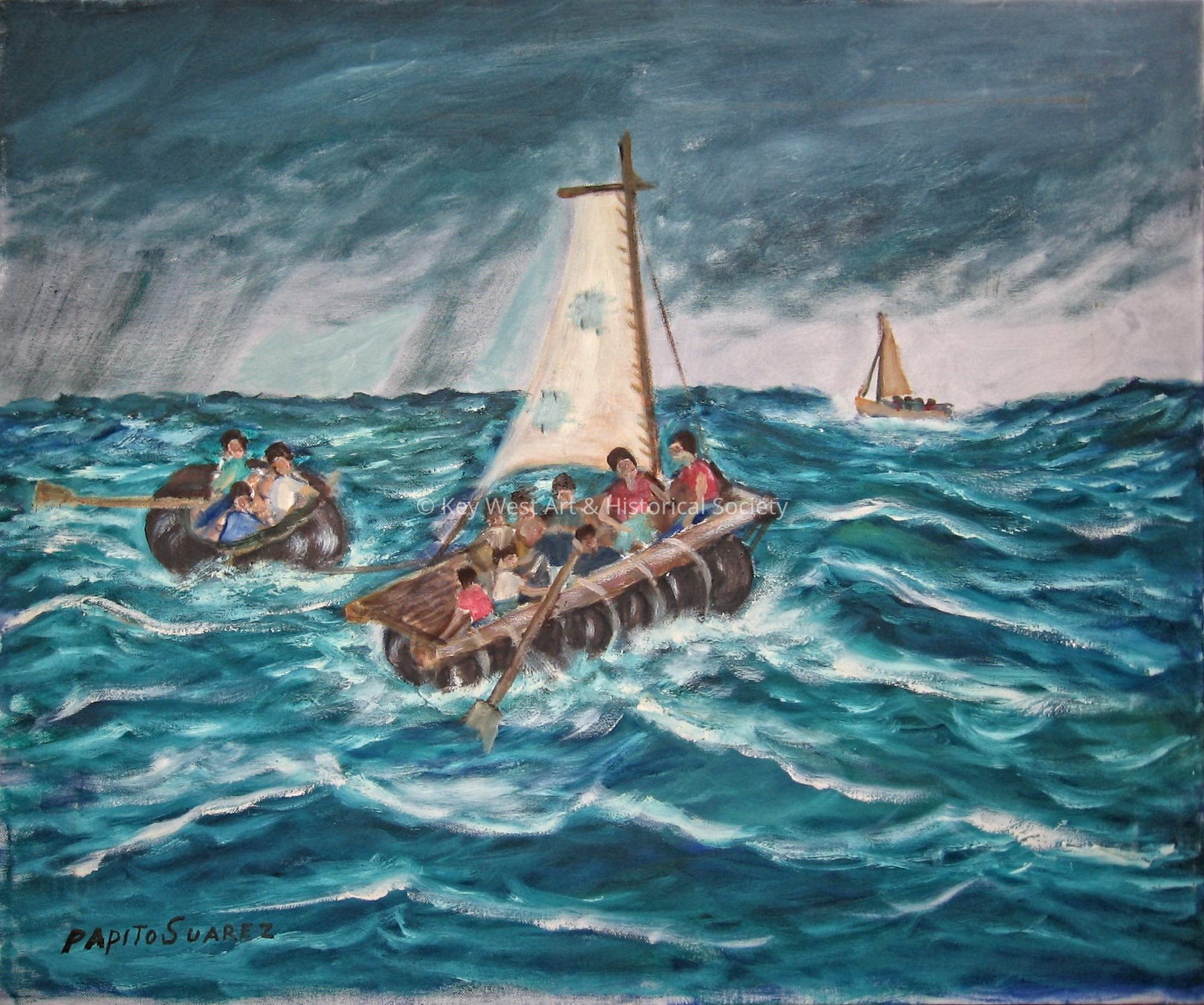 Oil on canvas painting by Papito Suarez depicting three small boats filled with Cuban refugees. Heavy rain storms are visible in the distance.Type of Painting