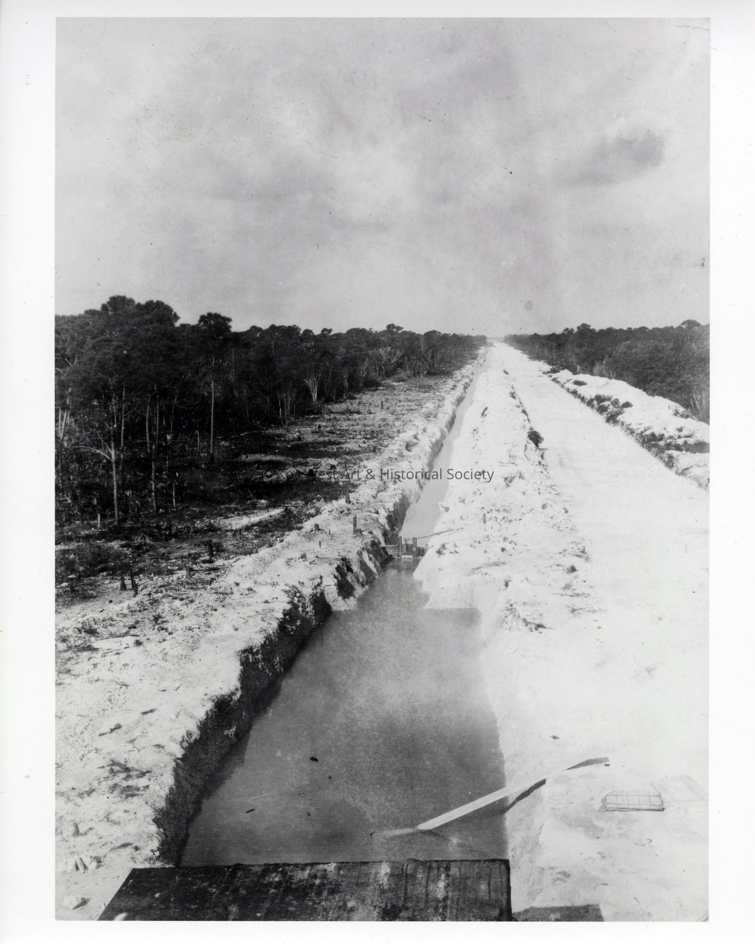 Black and white photograph of the beginnings of the railroad bed in Key Largo constructed by the Florida East Coast Railway.