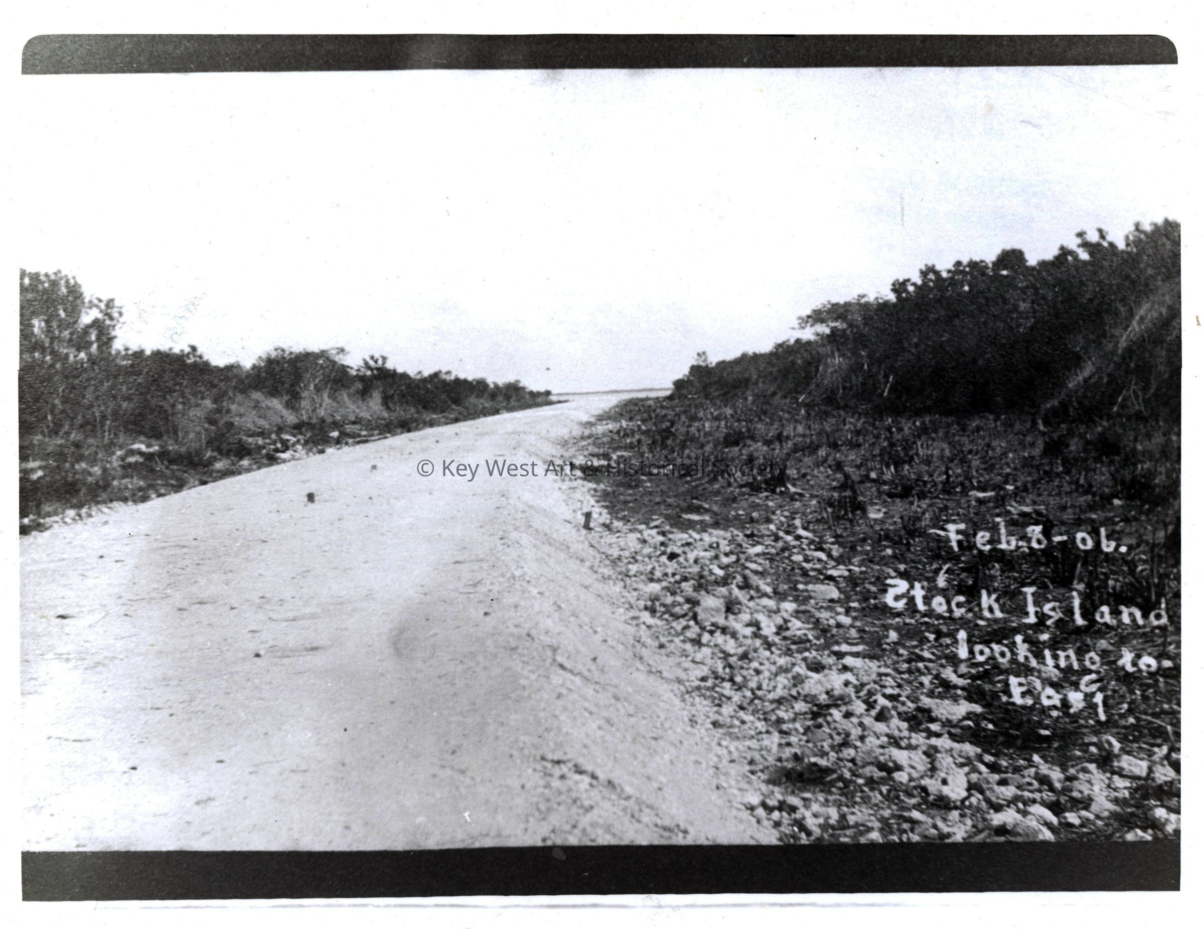 Black and white photograph of the railway roadbed on Stock island looking east built by the Florida East Coast Railway.
