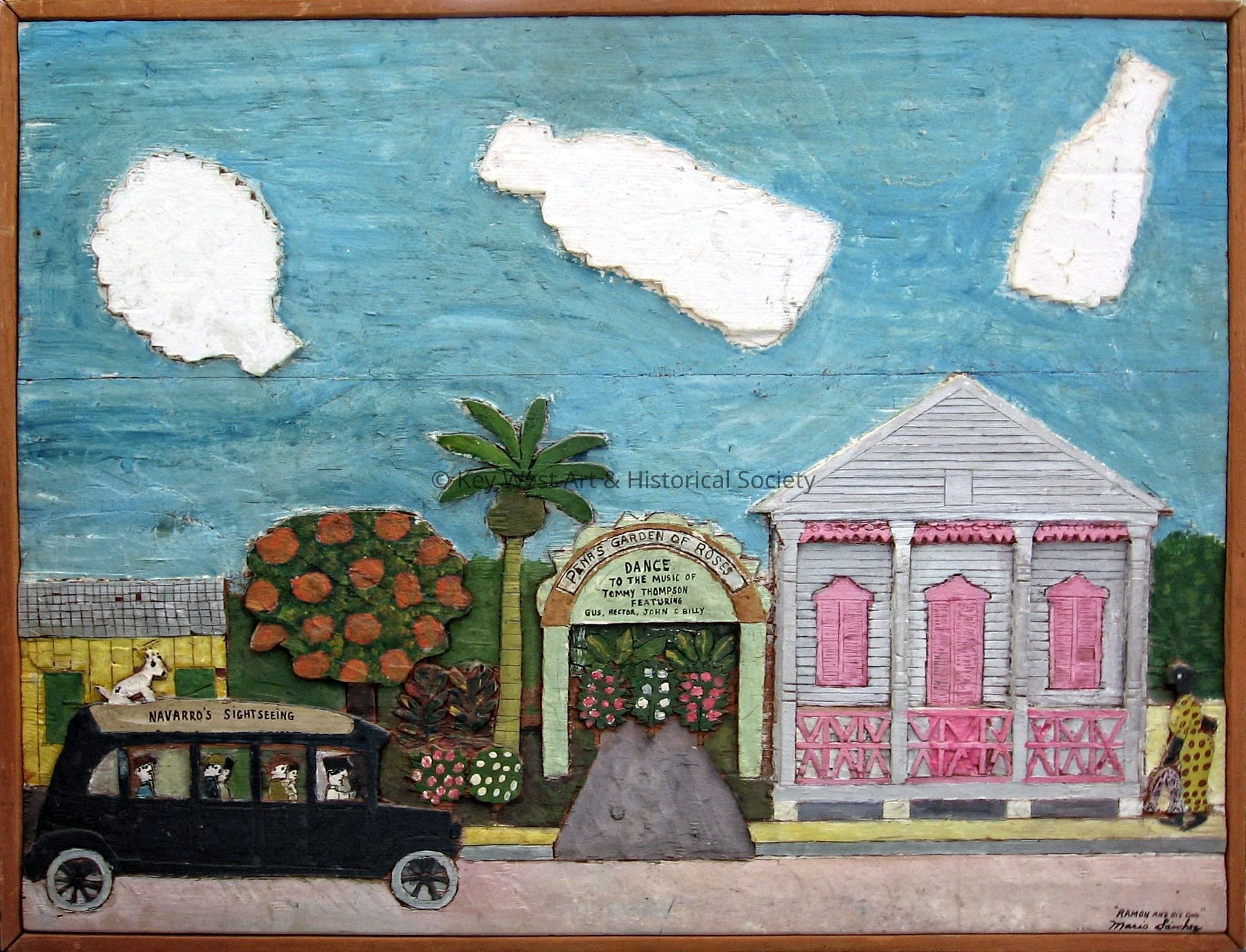 Caption in the file reads, 'Ramon Navarro was the official tour guide for Key West and his dog typically would perch on top of the bus for the ride through town. The Cuban nightspot, Pena's Garden of Roses, was a popular dance hall which was taken over by the Navy during the war. Notice the clouds in the shape of bottles'.Type of Sculpture