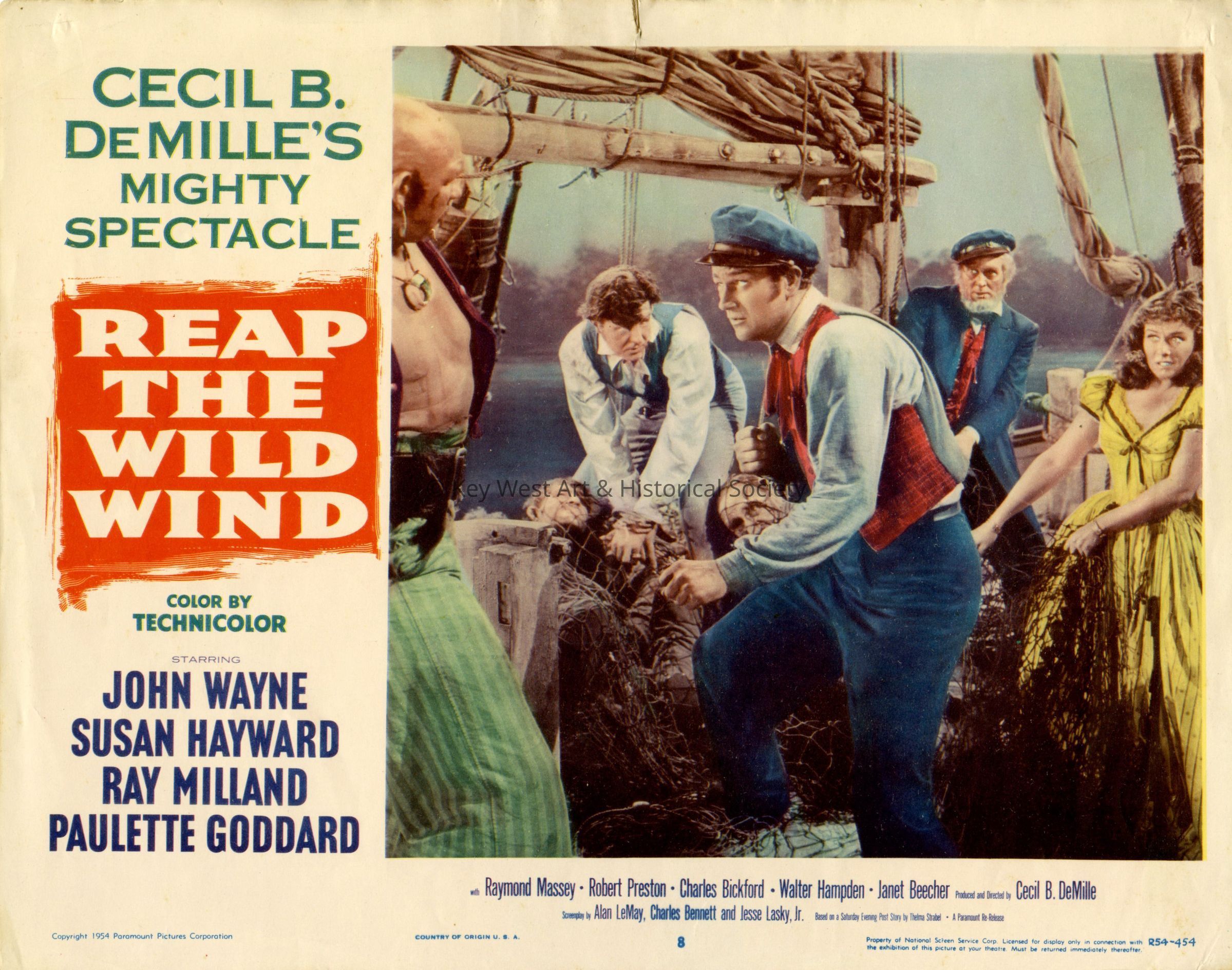 Movie lobby card promoting Cecil B. DeMille's film Reap the Wild Wind that was based on a story about Key West wreckers written as a Saturday Evening Post story by Thelma Strable. The film starred John Wayne, Susan Hayward, Ray Milland and Paulette Goddard.
