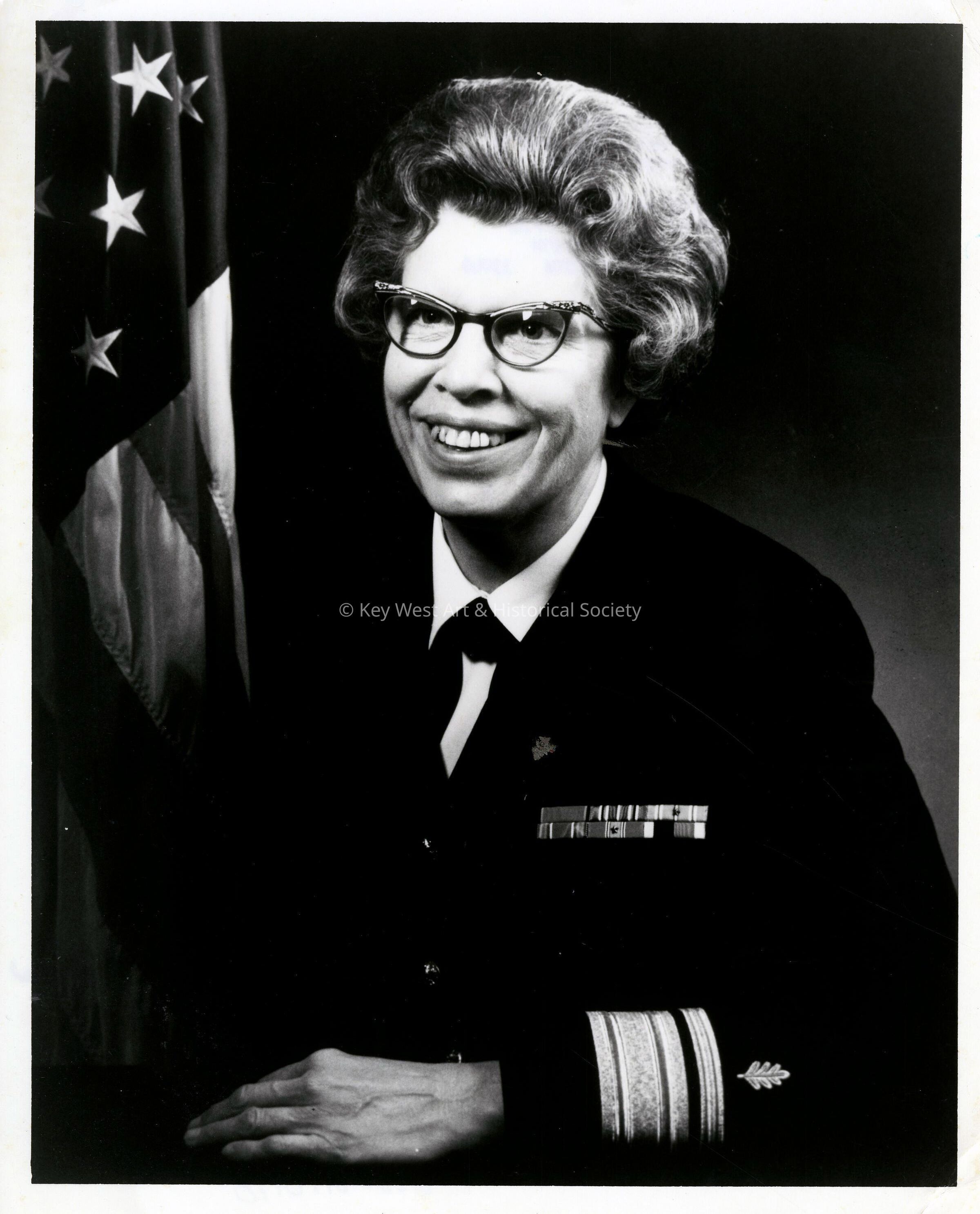 Black and white photograph of Rear Admiral Alene B Duerk. Duerk became the first female admiral in the U.S. Navy in 1972. She was also the director of the U.S. Navy Nurse Corps from 1970 to 1975.