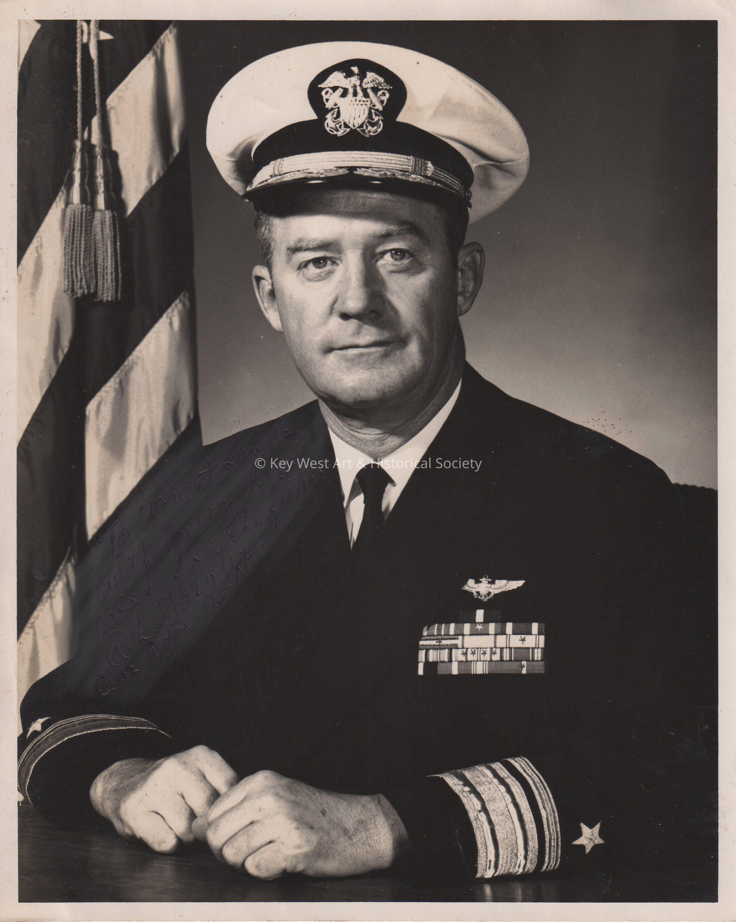 Signed photo of Rear Admiral Richard Fowler. Inscribed, 'To Wright Langley with every best wish for the future, Rich Fowler, Rear Admiral, USN.' A June 19, 1967 obituary accompanies this photo. The obituary indicates that Admiral Fowler died in a fire at his home at Glenview Naval Air Station, Illinois.Photograph Details