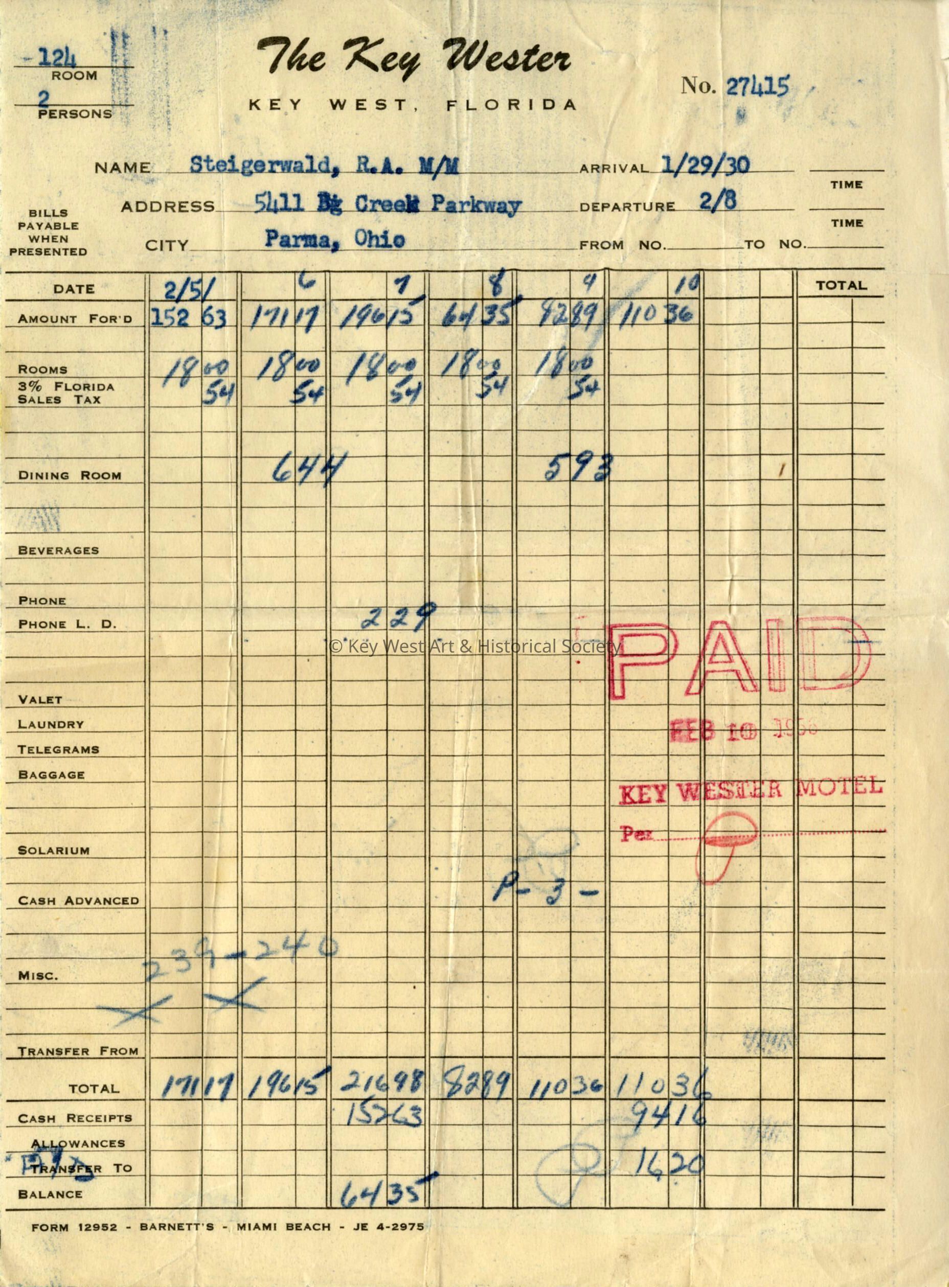 Page two of a two page receipt from the Key Wester Hotel for Mr. and Mrs. Dick Steigerwald (Richard and Joan) who spent their honeymoon in Key West from January 29 to February 8, 1956.Collection
