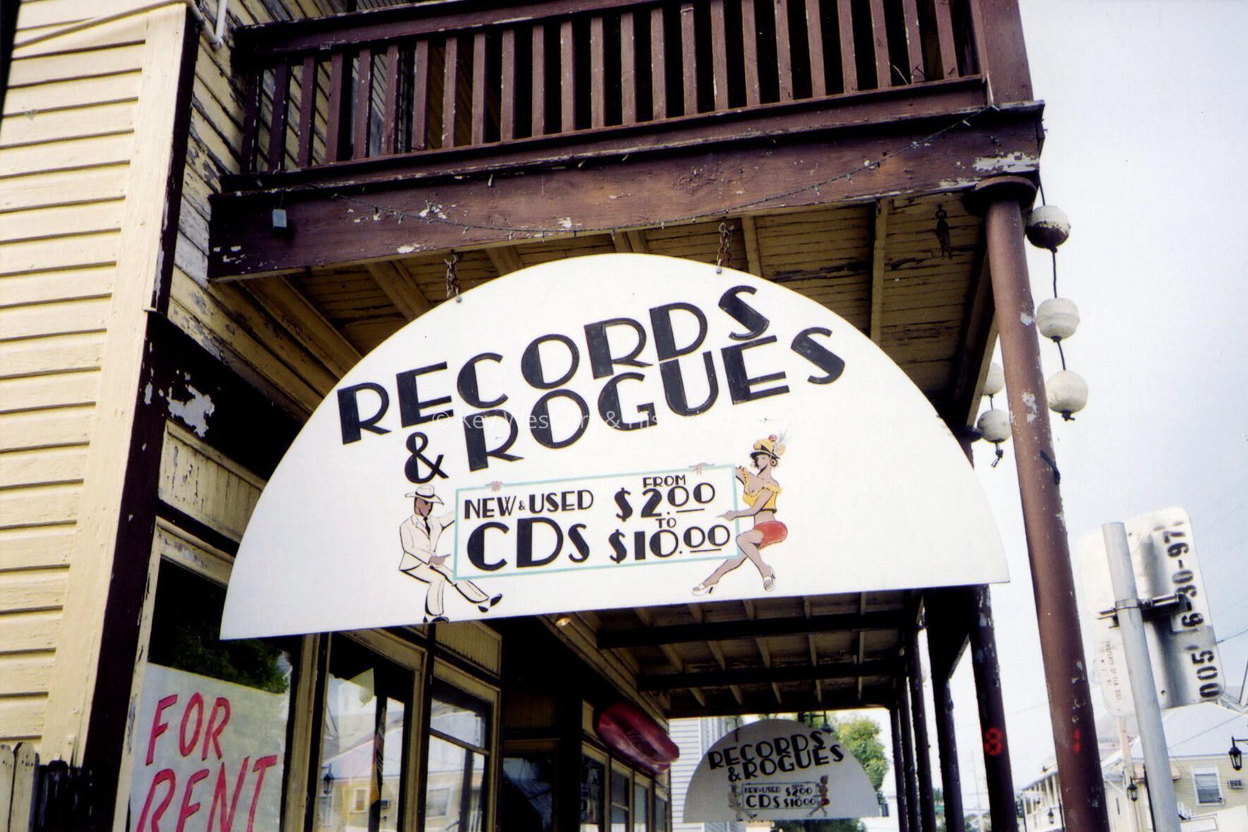 Color photograph taken by historian James M. Goode of the sign for Records & Rogues at 1018 Truman Avenue during a trip to Key West in February 2001. Printed from Roll 2.Photograph Details