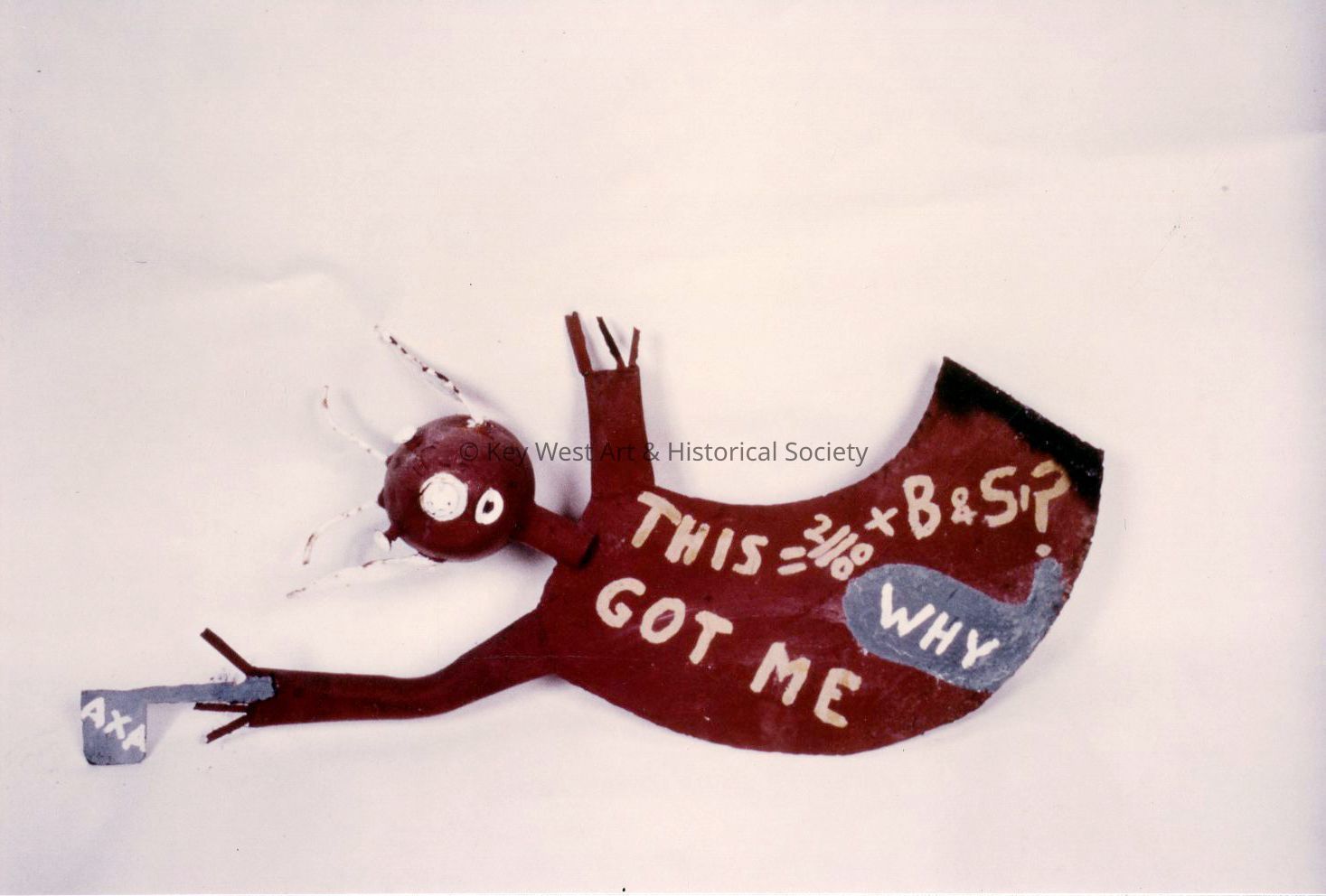 Freestanding sculpture by Stanley Papio depicting a devilish sprite painted red front and back with white ears, feelers, eyes, nose and mouth. Intended to hang. The figure holds a blue 'axe' with painted lettering that reads 'This = 2//00 +B&S?' 'Got Me'. Outlined in blue is 'WHY'.Type of Sculpture
