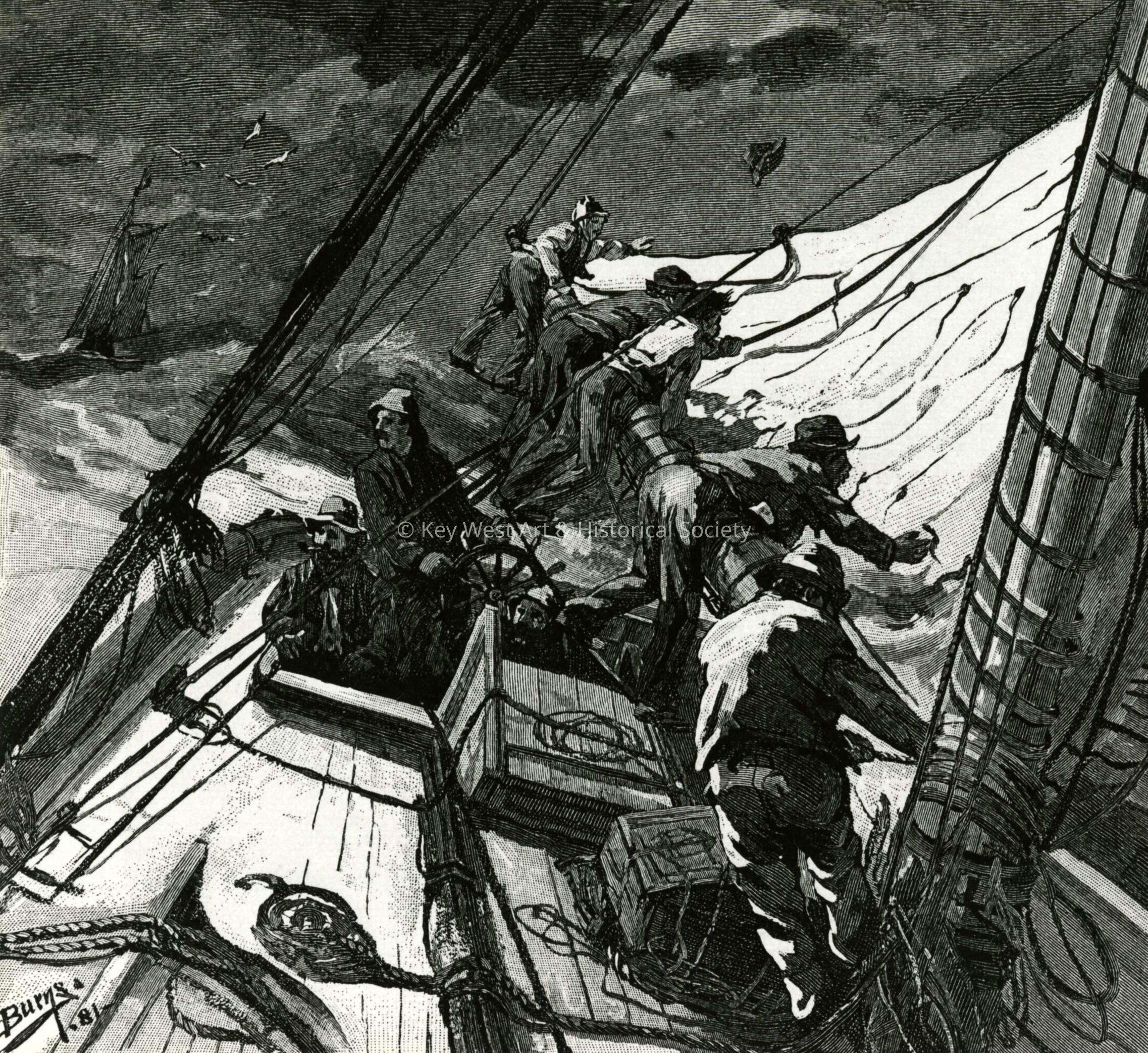 Black and white photograph taken from an illustration entitled 'Reefing the Mainsail' from The Century Illustrated Monthly Magazine, November 1881-April 1882. Illustration used to depict the wrecking industry.