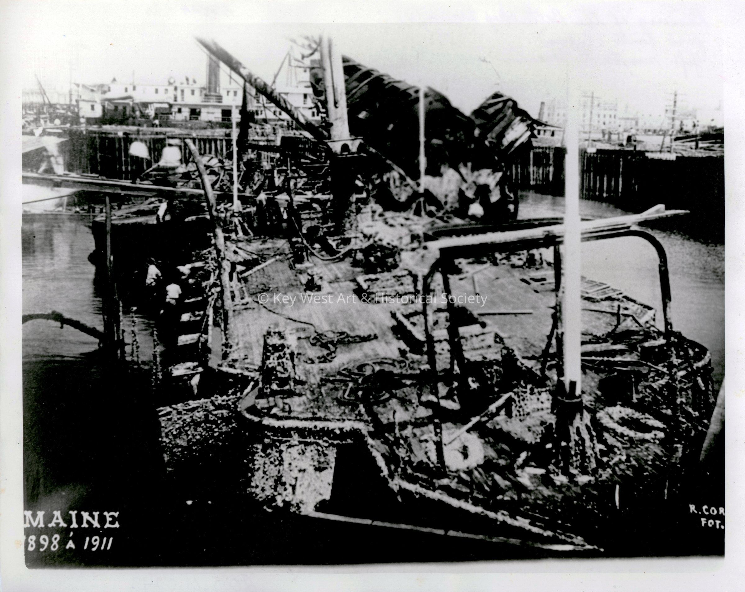 Black and white photograph of the raising of the U.S.S. MAINE after it sunk in Havana Harbor.