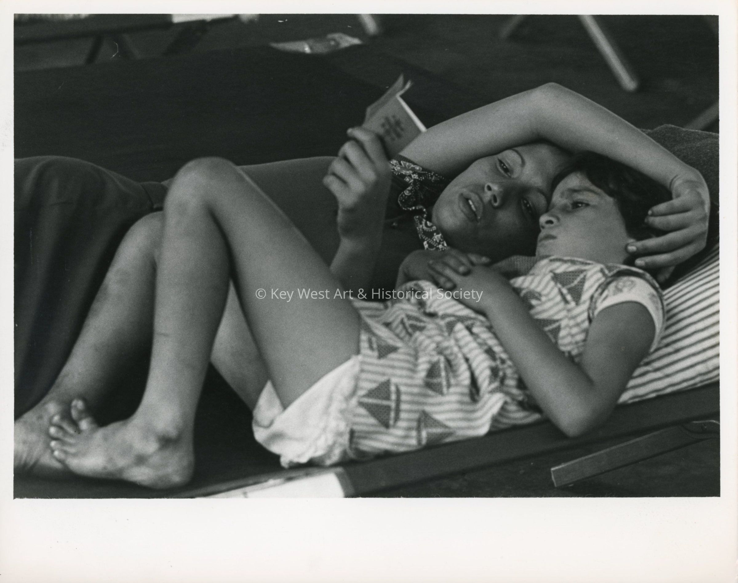 Black and white photograph of a Cuban woman reading to her daughter on a cot in a Cuban refugee camp at Trumbo Point Annex.