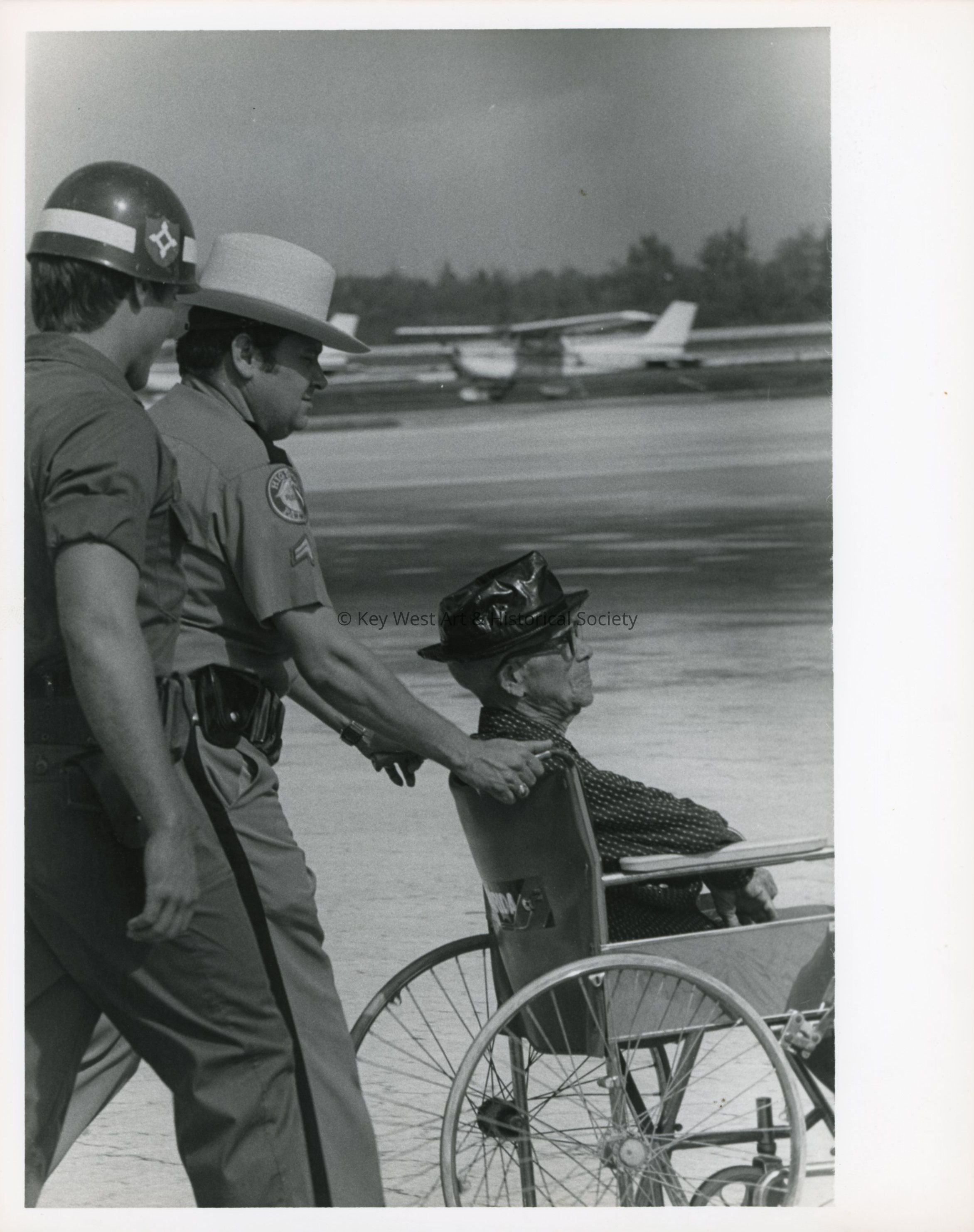 Black and white photograph of a highway patrolmen assisting an elderly Cuban man across the tarmac to a plane en route to Eglin Air Force Base to be processed into the United States.
