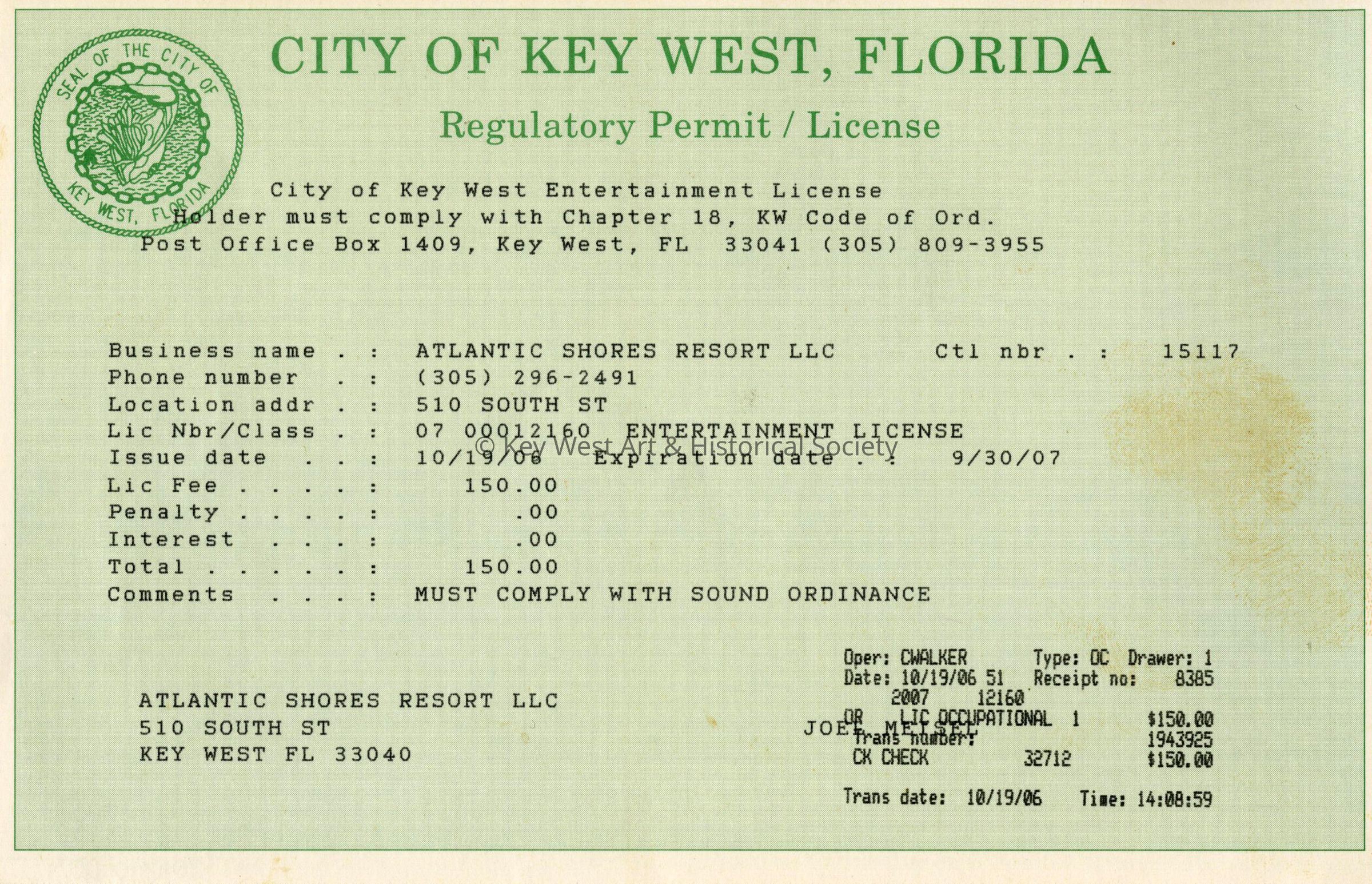 Regulatory Permit/License for Atlantic Shores Resort at 510 South Street effective October 19, 2006, issued by the City of Key West.Collection