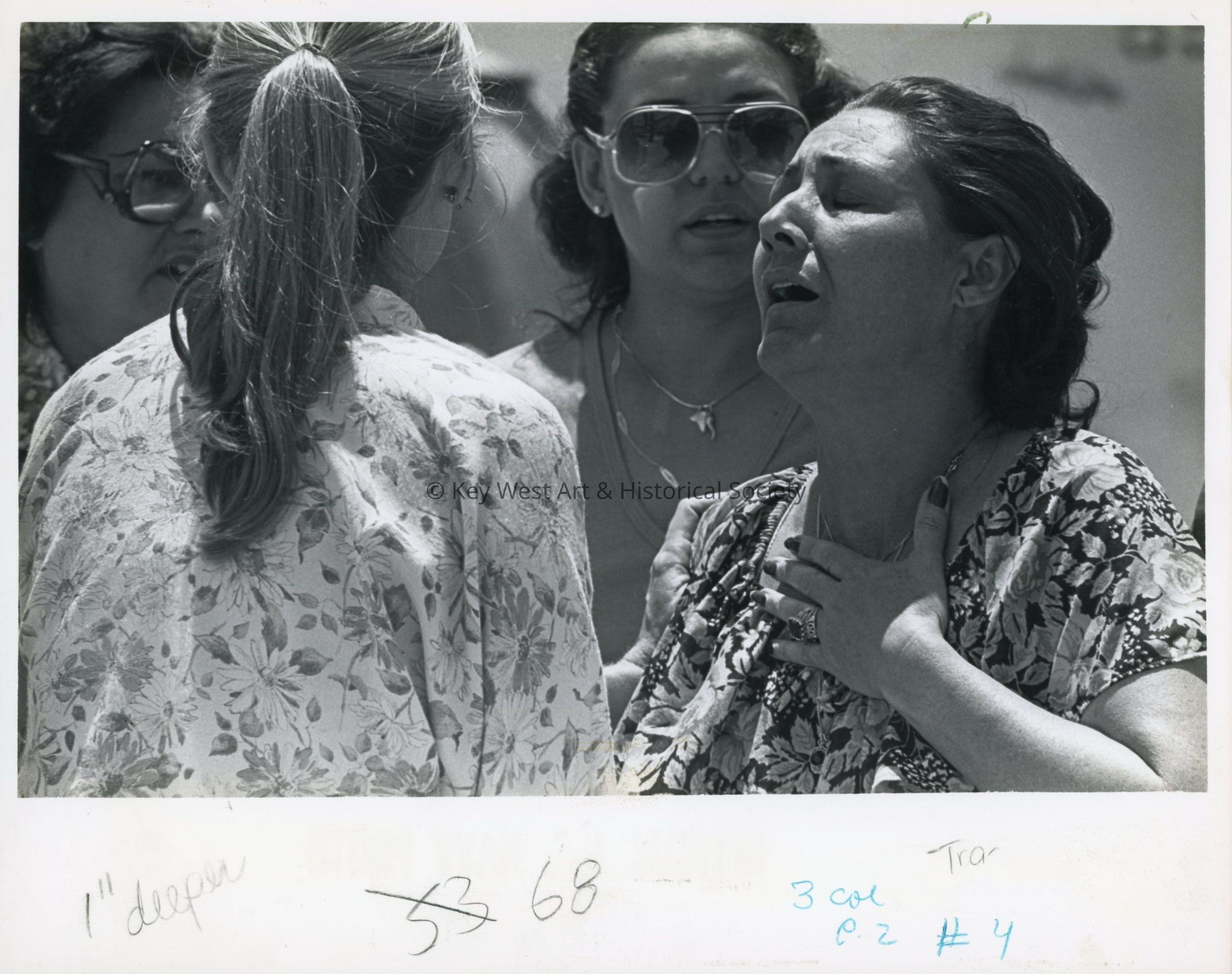 Black and white photograph of a Cuban woman breathing a sigh of relief to be safely in Key West after a long journey from Mariel Harbor.