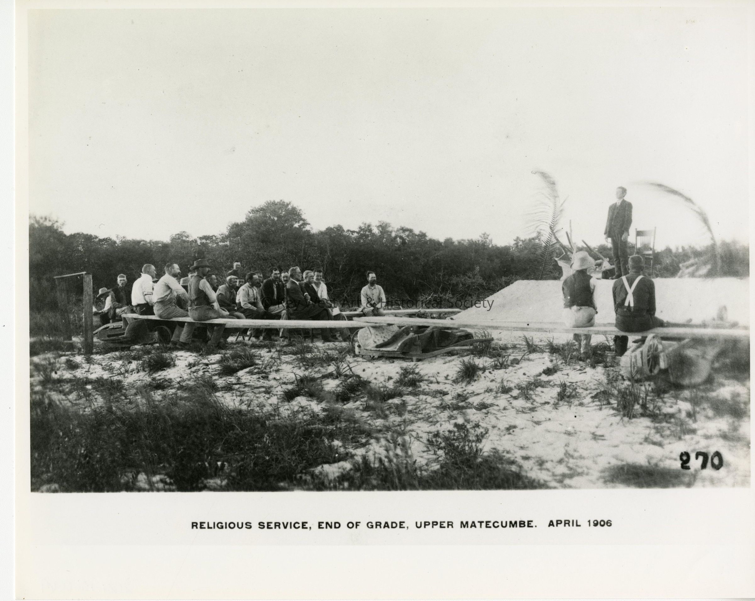 Black and white photograph of Florida East Coast Railway construction workers attending religious services on Upper Matecumbe.