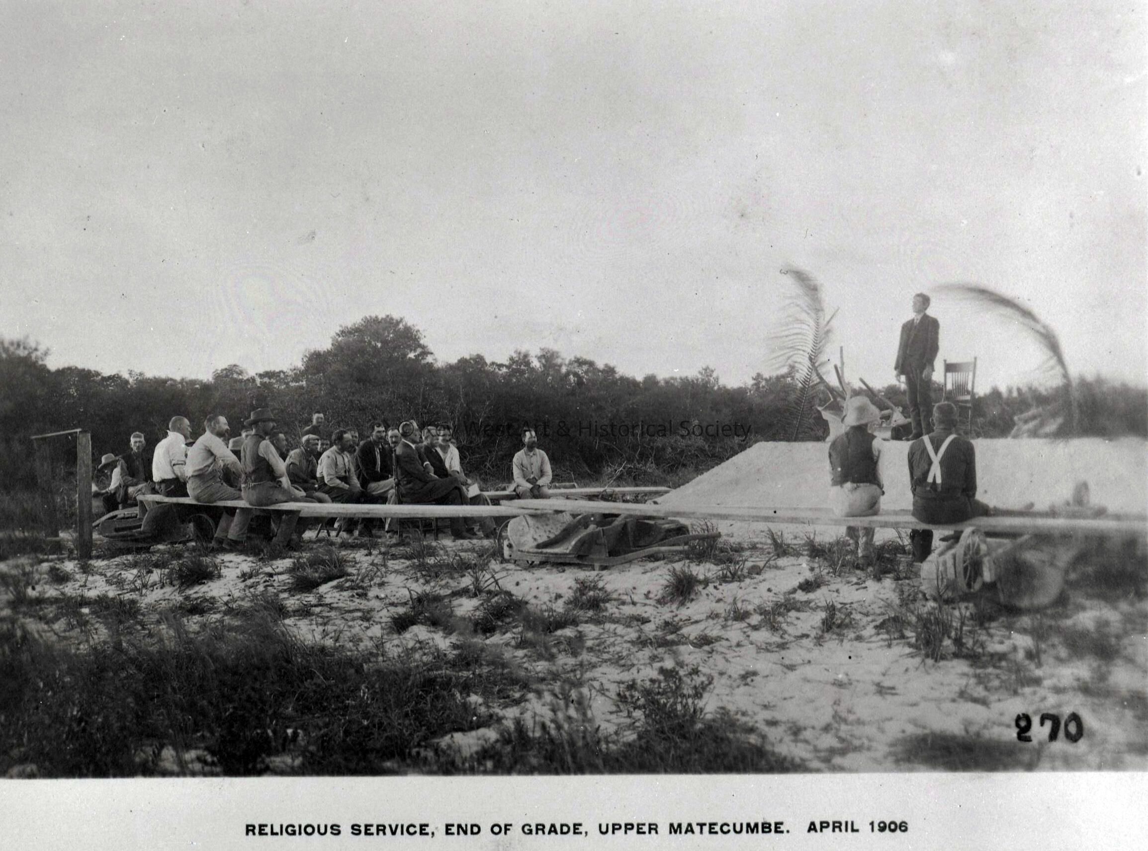 Black and white negative of Florida East Coast Railway construction workers attending religious services on Upper Matecumbe.