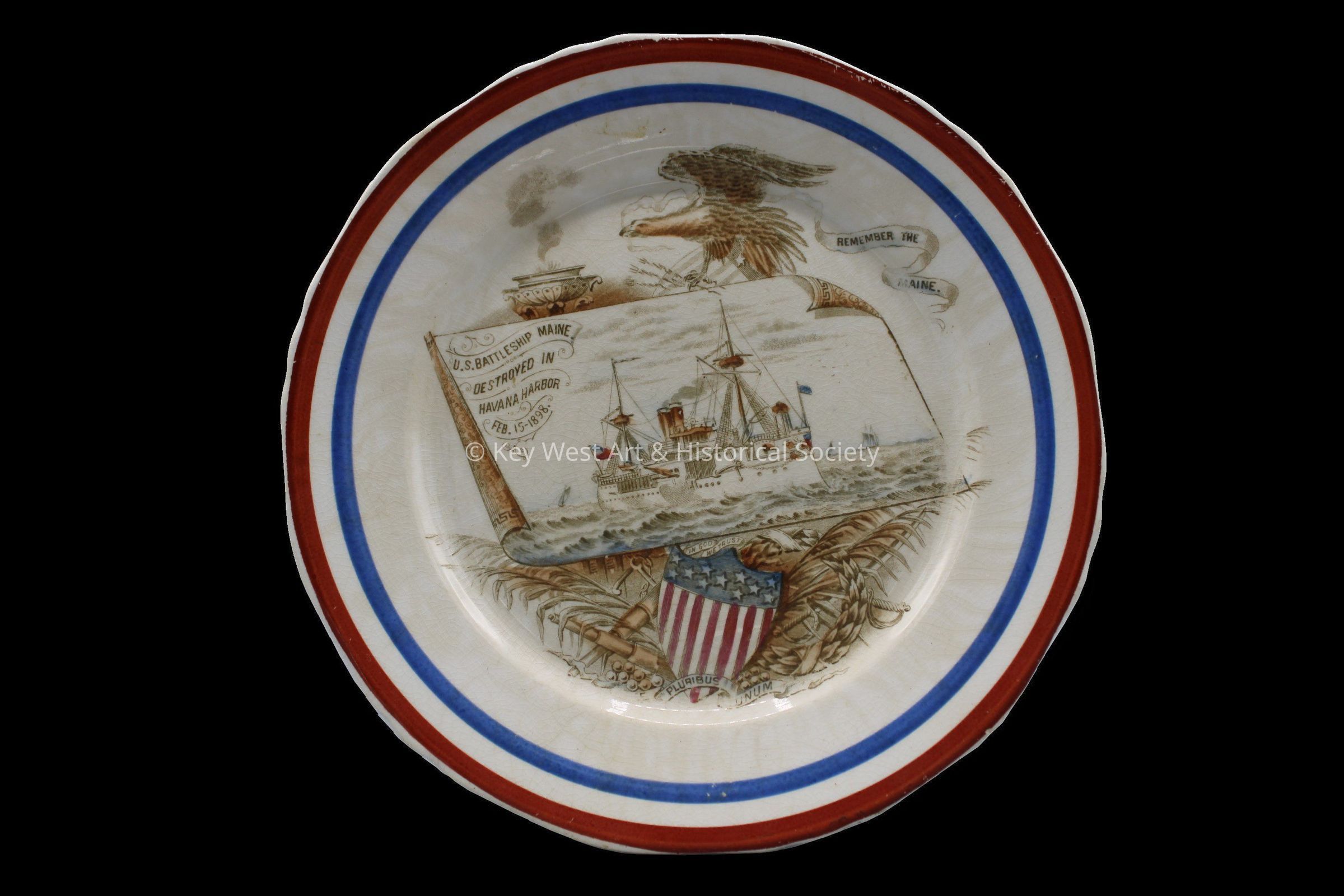 A glazed ceramic commemorative plate depicting an illustration of the undestroyed USS Maine with an eagle above and the Great Seal shield below. Lettering on the plate reads 'REMEMBER THE MAINE' and 'U.S. BATLESHIP MAINE DESTROYED IN HAVANA HARBOR FEB. 15-1898.' The back of the plate has lettering that reads 'PATENT APPLIED FOR.'