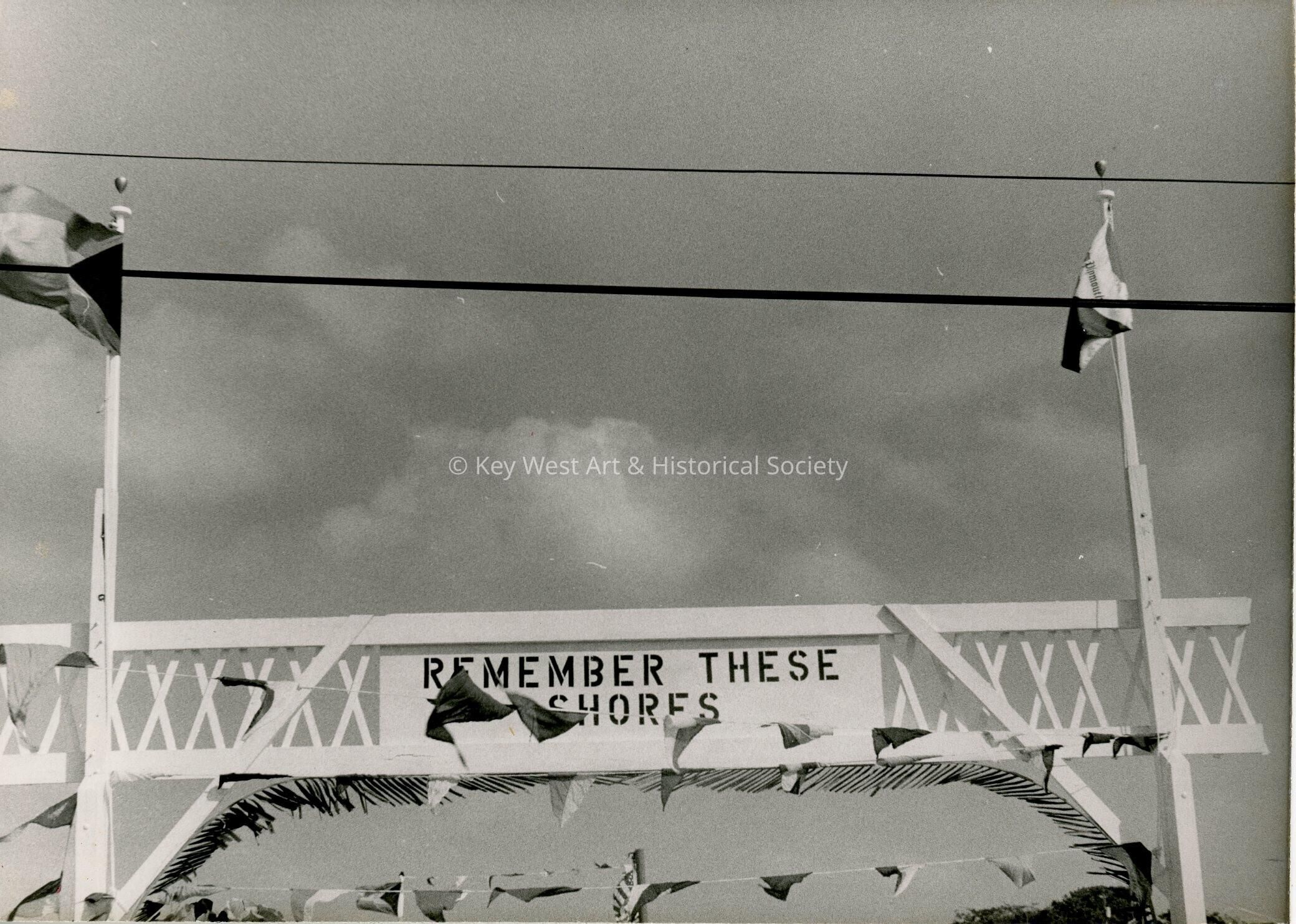 Black and white photograph of an archway holding a sign that reads, 'Remember These Shores'. Possibly taken in Green Turtle Cay, The Bahamas, during the Island Roots Festival.Photograph Details