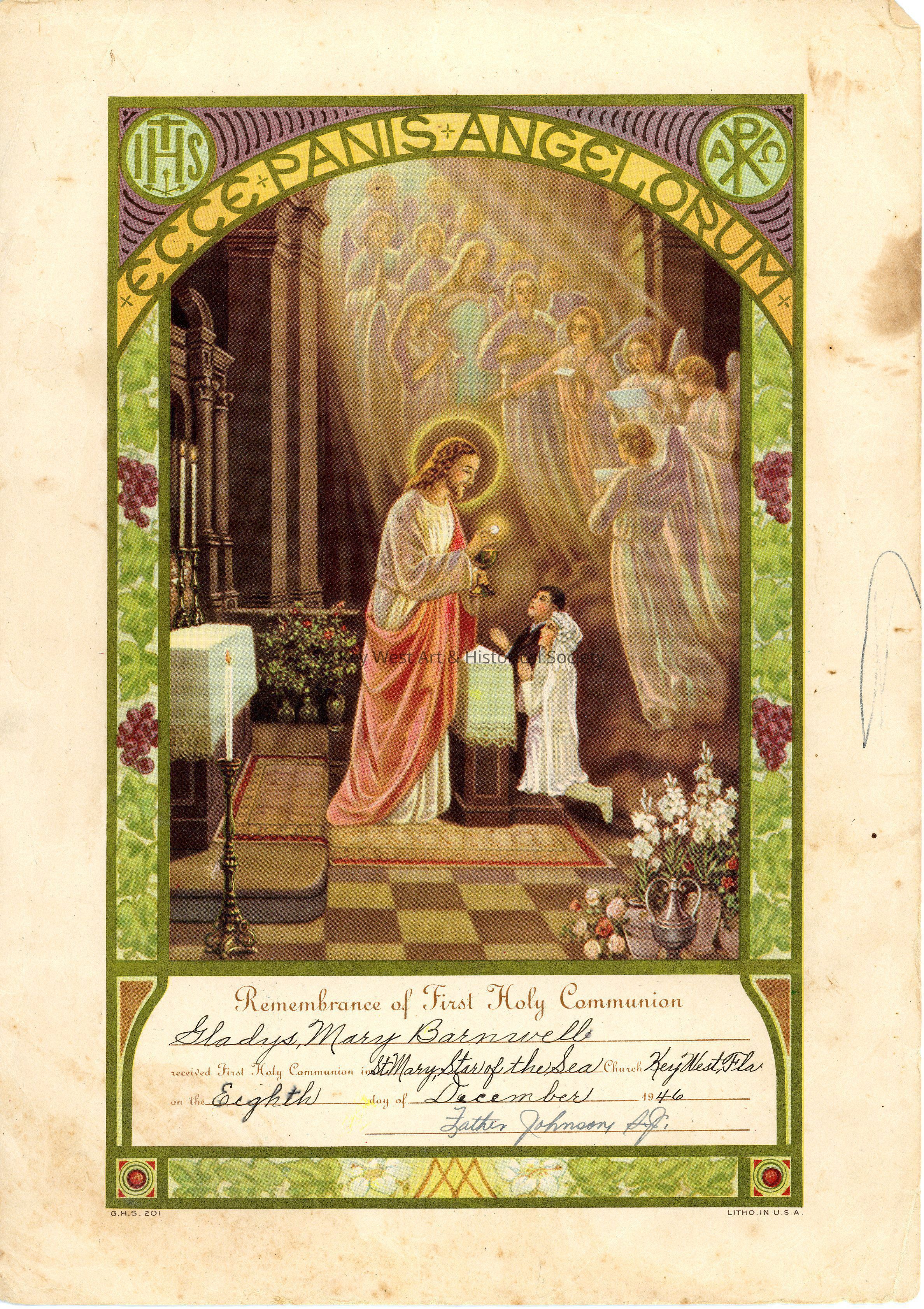 Certificate of First Holy Communion from St. Mary Star of the Sea Church, dated 1946, belonging to Gladys Marie Tomandl (nee Barnwell).Collection