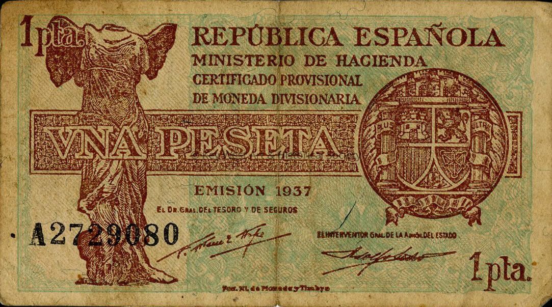 Republica de Espanola issued 1 Peseta note dated 1937, held by Ernest Hemingway. From the contents of Hemingway's wallet.Collection