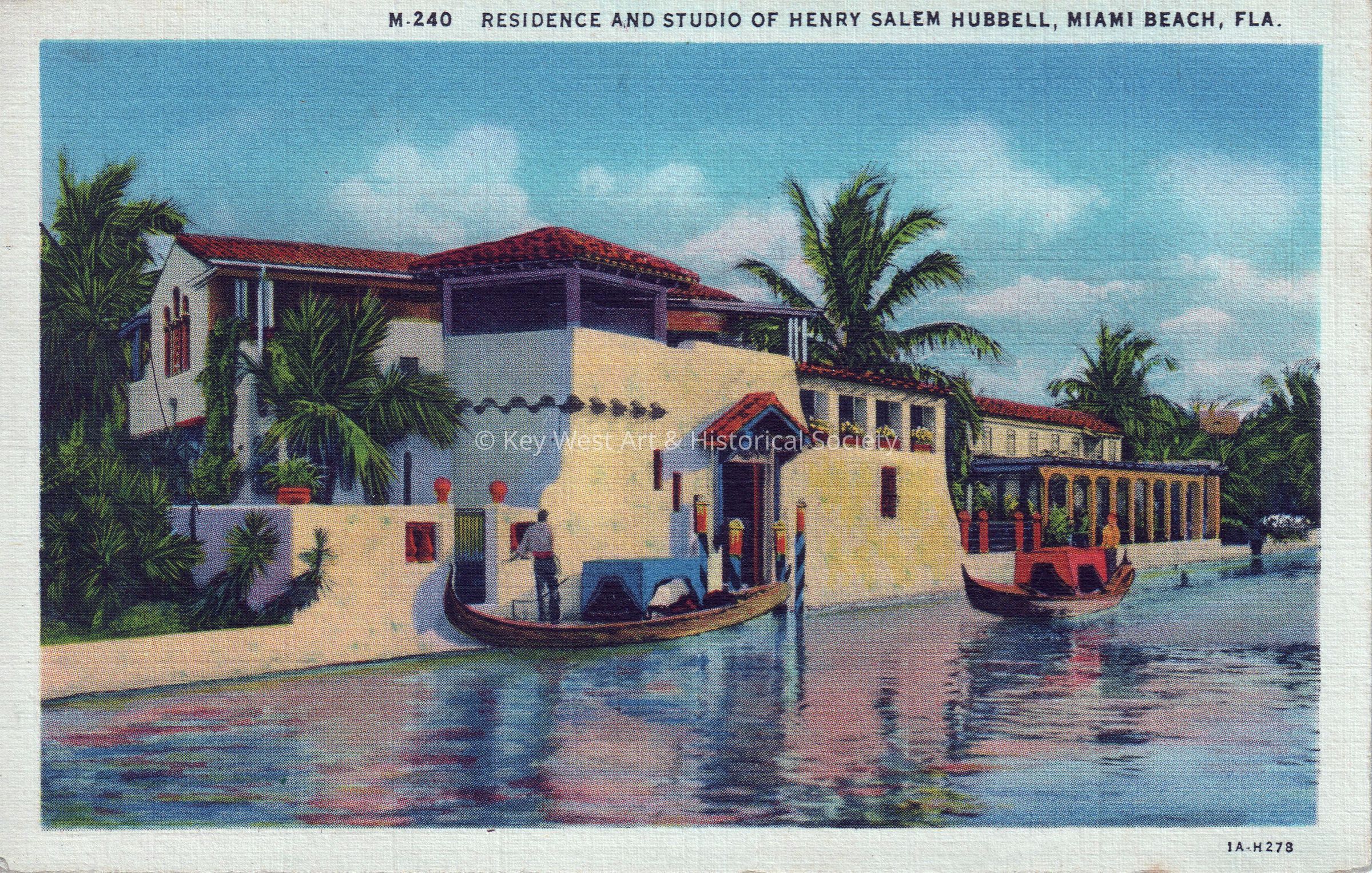 Postcard depicting boats on a canal beside a building. The caption reads, ‘Residence and Studio of Henry Salem Hubbell, Miami Beach, Florida.’Collection
