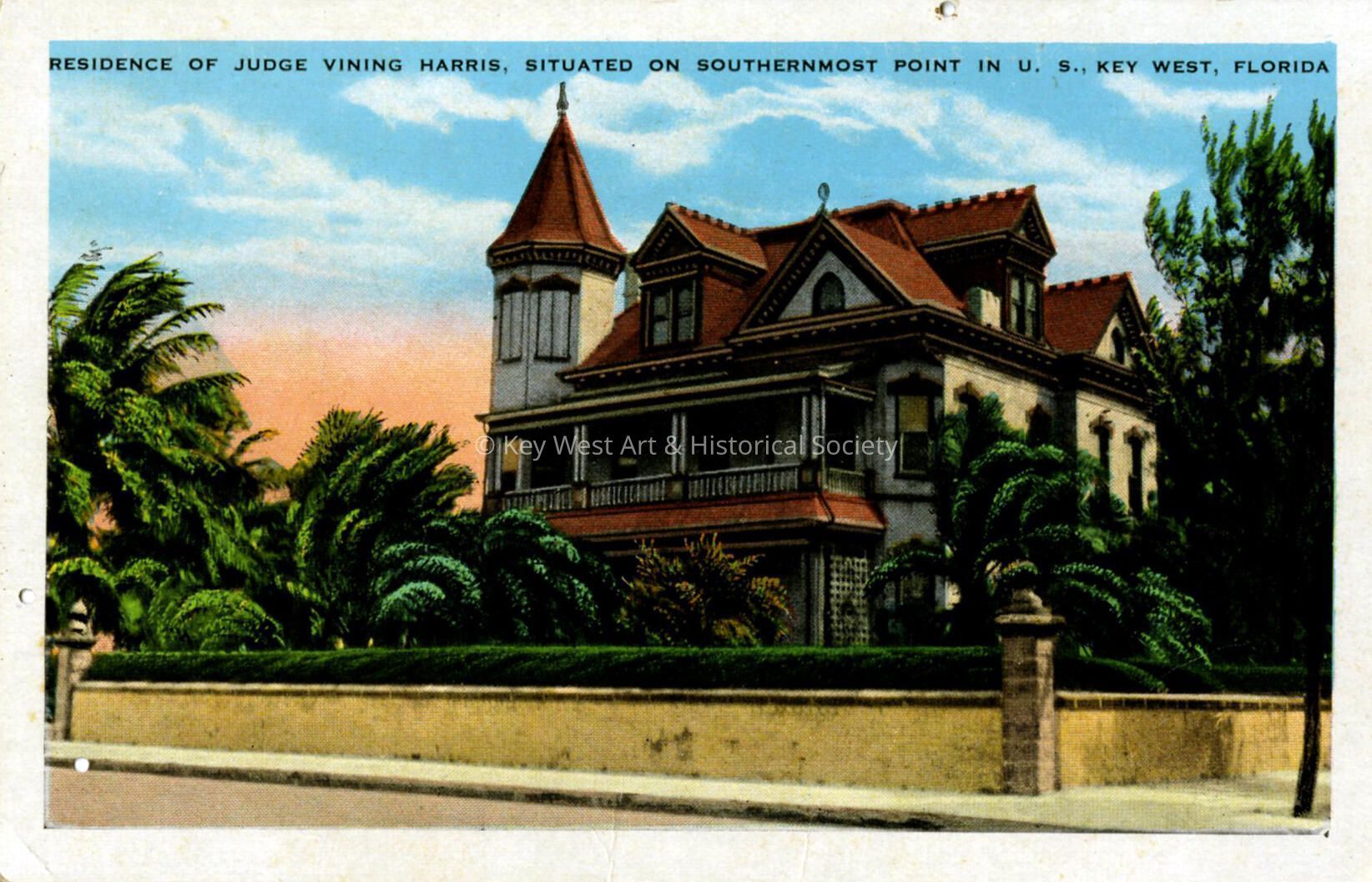 Postcard depicting the Southernmost House at 1400 Duval Street. The caption reads, 'Residence of Judge Vining Harris, Situated on Southernmost Point in U.S., Key West, Florida.' Notation on verso, 'The Judge Vining Harris home is situated on the Southernmost point of the United States, built of red brick and with wide verandas in a beautiful garden on the ocean side of the island.'Subject Place