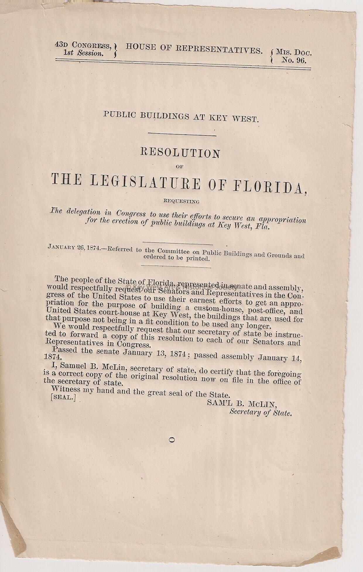 Resolution from the Legislature of Florida requesting the United States Senate to build a public building in Key West, Florida, that would contain a Federal Court House, Post Office, and Custom House.Collection