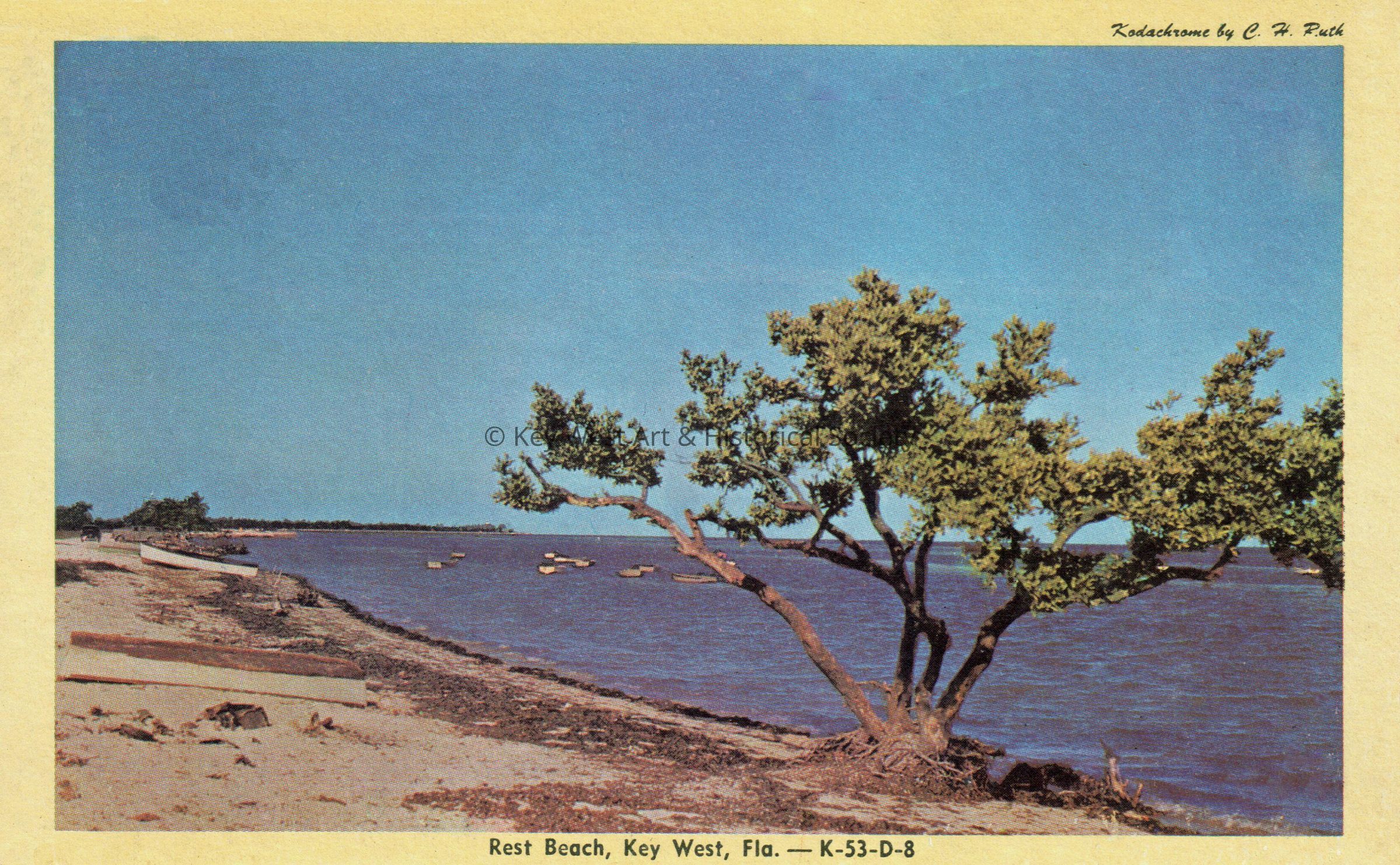 Postcard depicting a tree on Rest Beach. The caption reads, ‘Rest Beach, Key West, Florida’.Subject Place