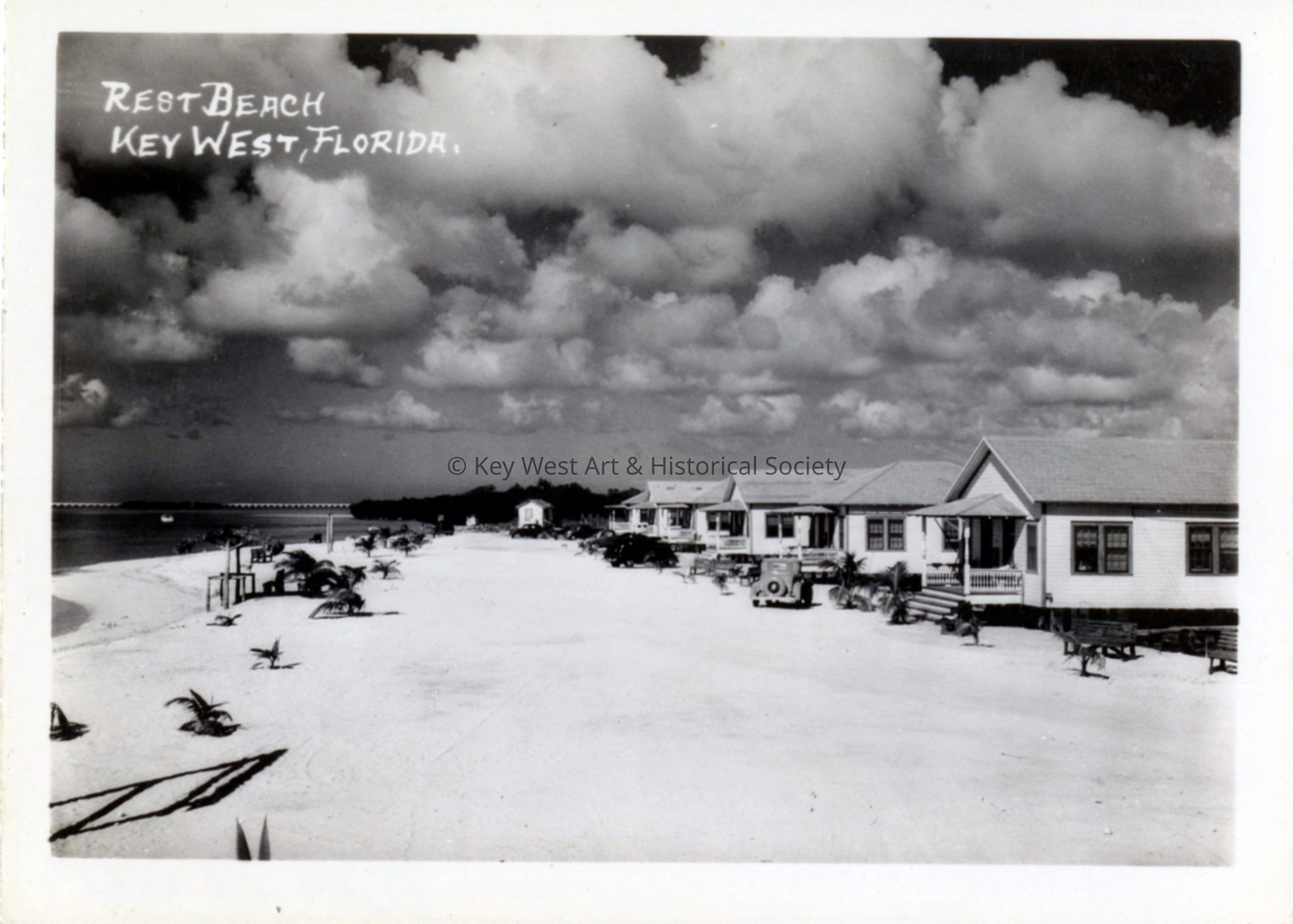 Black and white photograph of Luther Pinder's tourist cabins on Boca Chica beach. Caption of Rest Beach is incorrect.