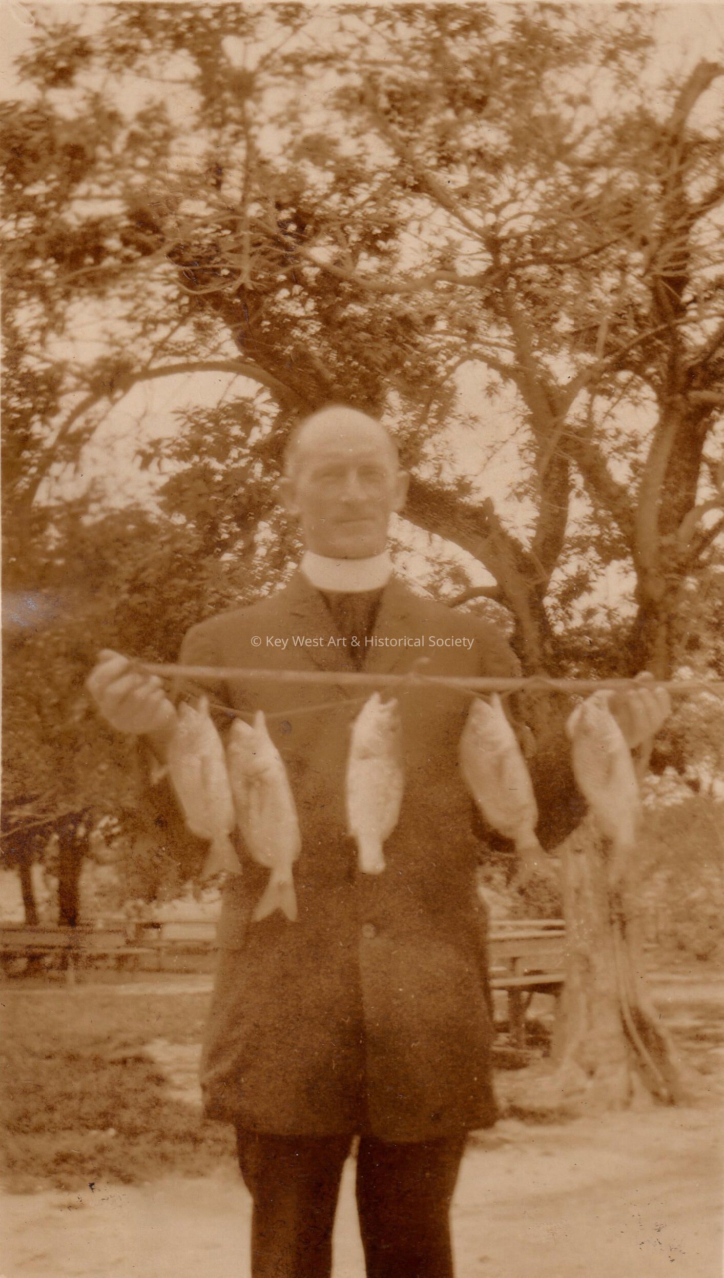 Black and white photograph of Reverend l'Abbe Laberge, holding a fish, from the Convent of Mary Immaculate. Image from the scrapbook of Sister Marie Caroline.