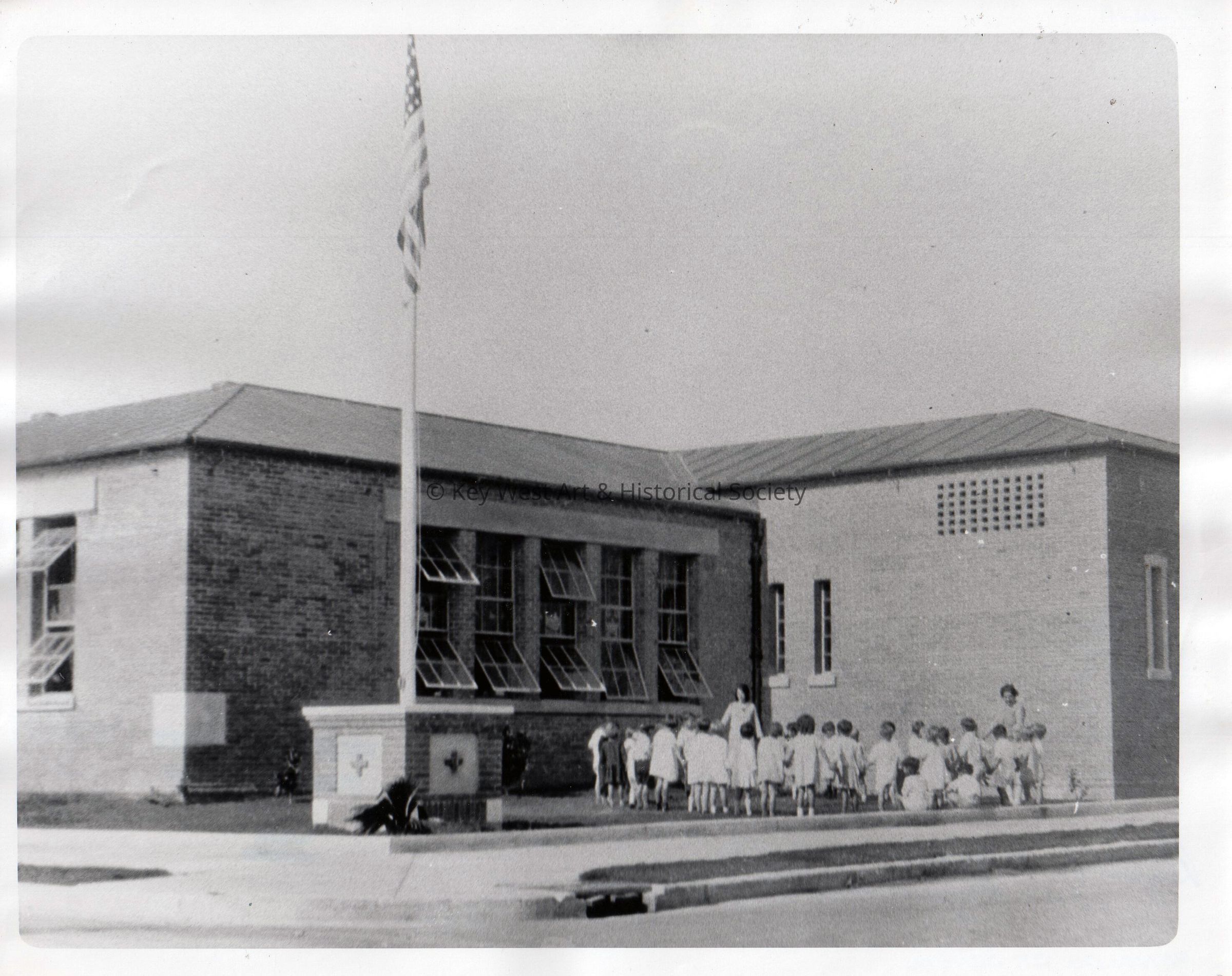 Black and white photograph of Reynolds School at 1316 Reynolds Street. Students and teachers outside.