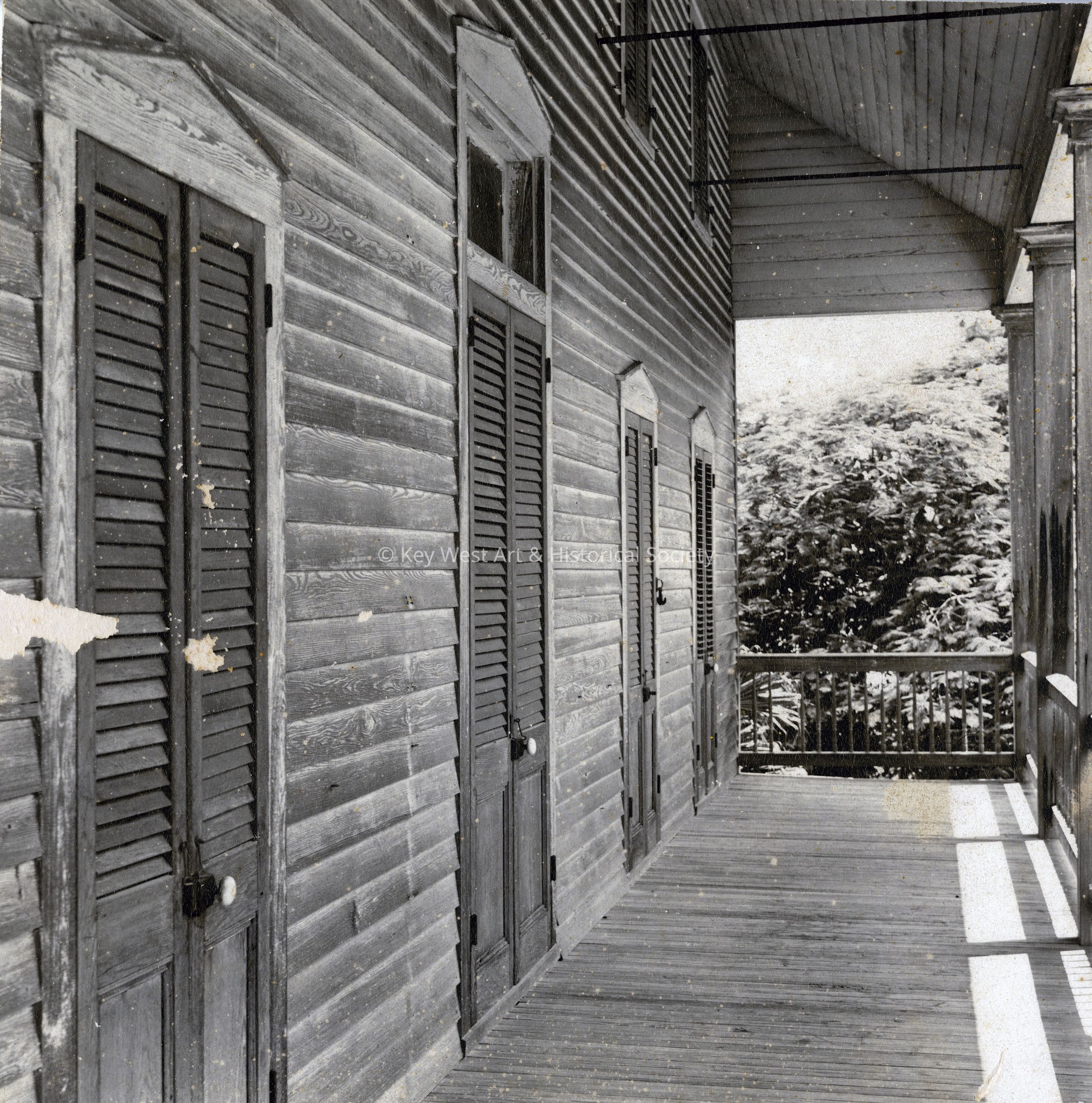 Black and white photograph of the second floor porch belonging to the Cypress House at 601 Caroline Street. The house was built in 1887 by John Sawyer for Richard Kemp.