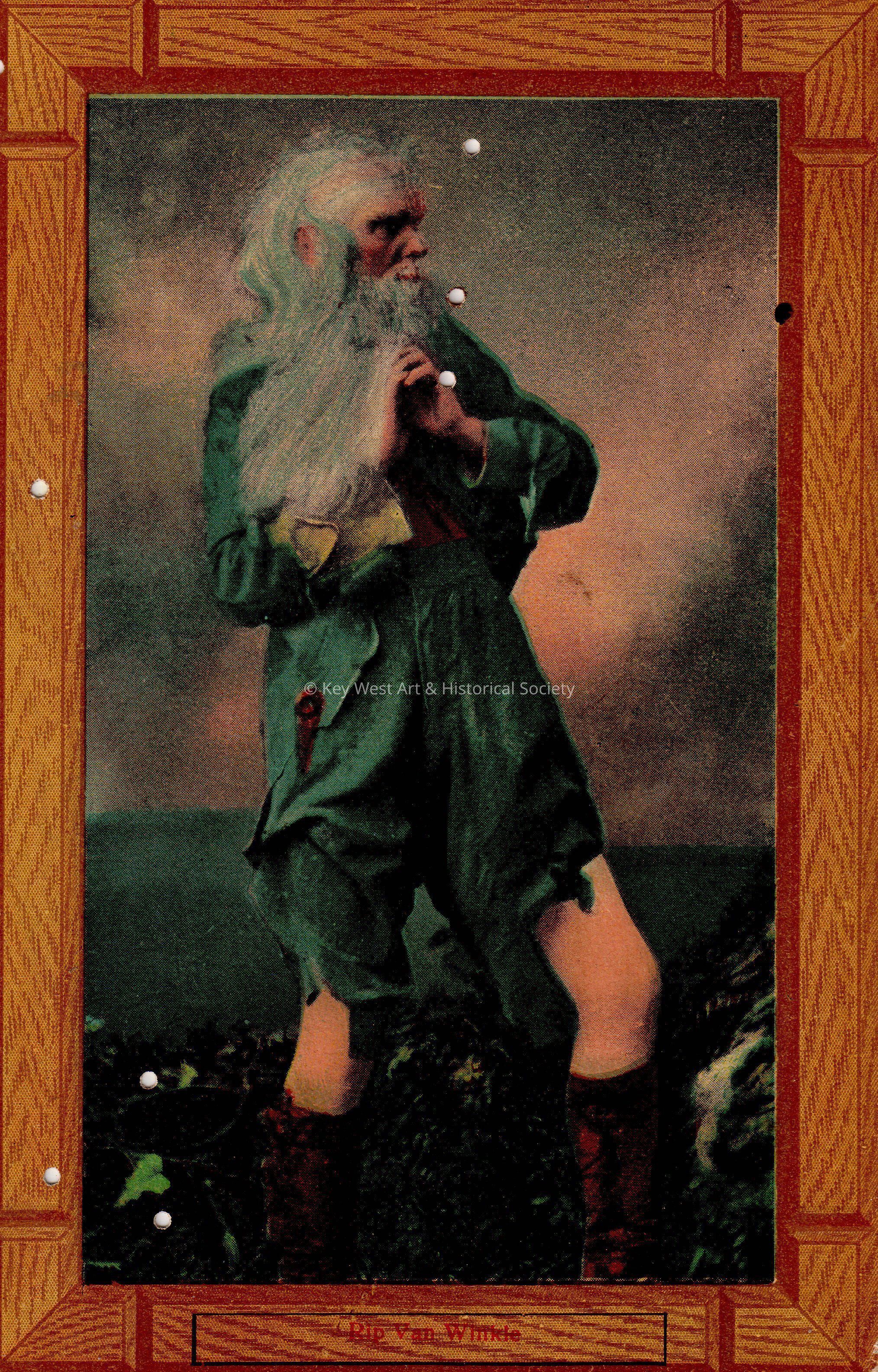 Postcard depicting Rip Van Winkle, a character based on the short story by the American author Washington Irving, first published in 1819. It follows a Dutch-American villager in colonial America named Rip Van Winkle who meets mysterious Dutchmen, imbibes their liquor and falls asleep in the Catskill Mountains. He awakes 20 years later to a very changed world, having missed the American Revolution.Collection